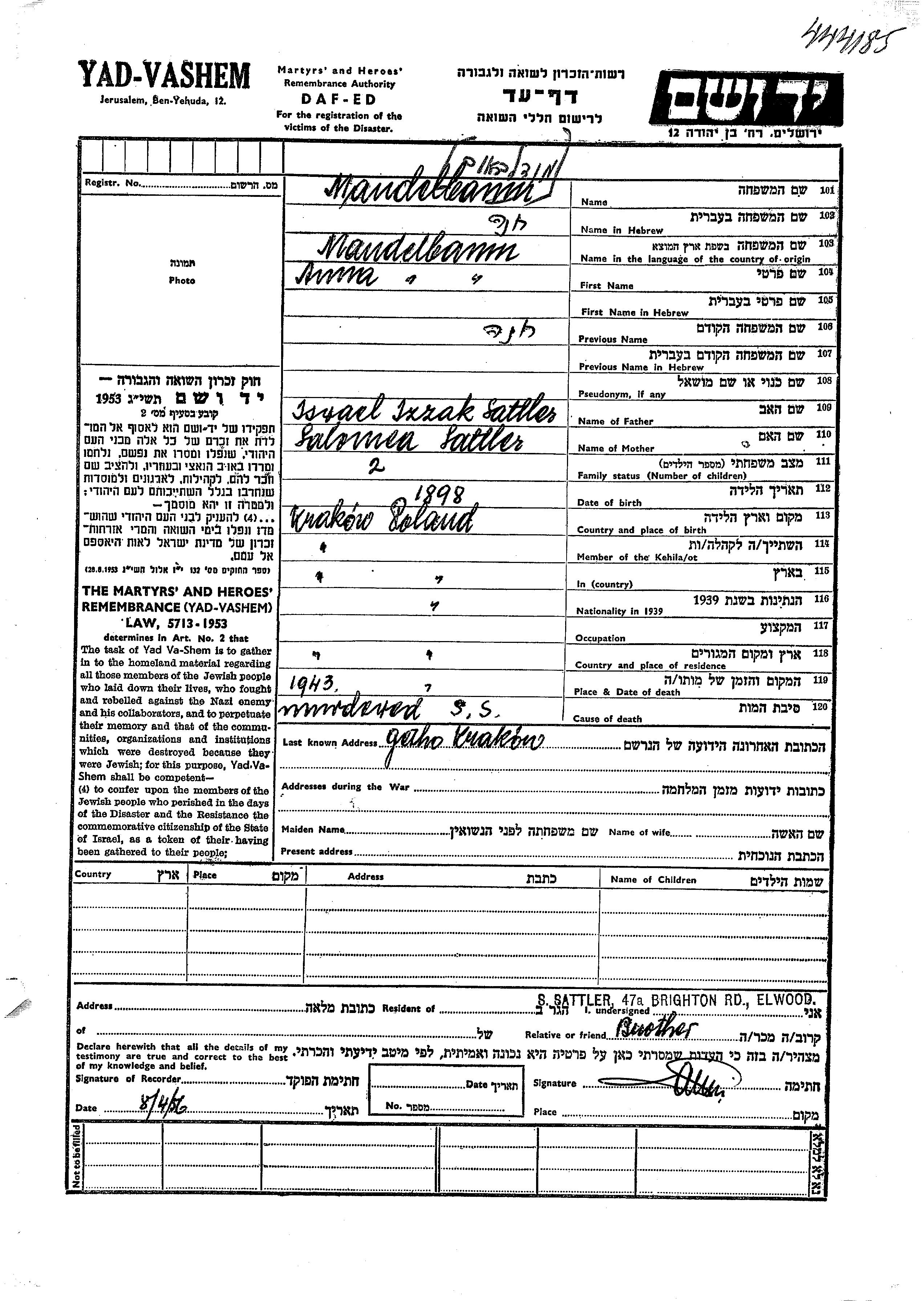 Mandelbaum Anna Khana 1898 Krakow, Poland Page of Testimony