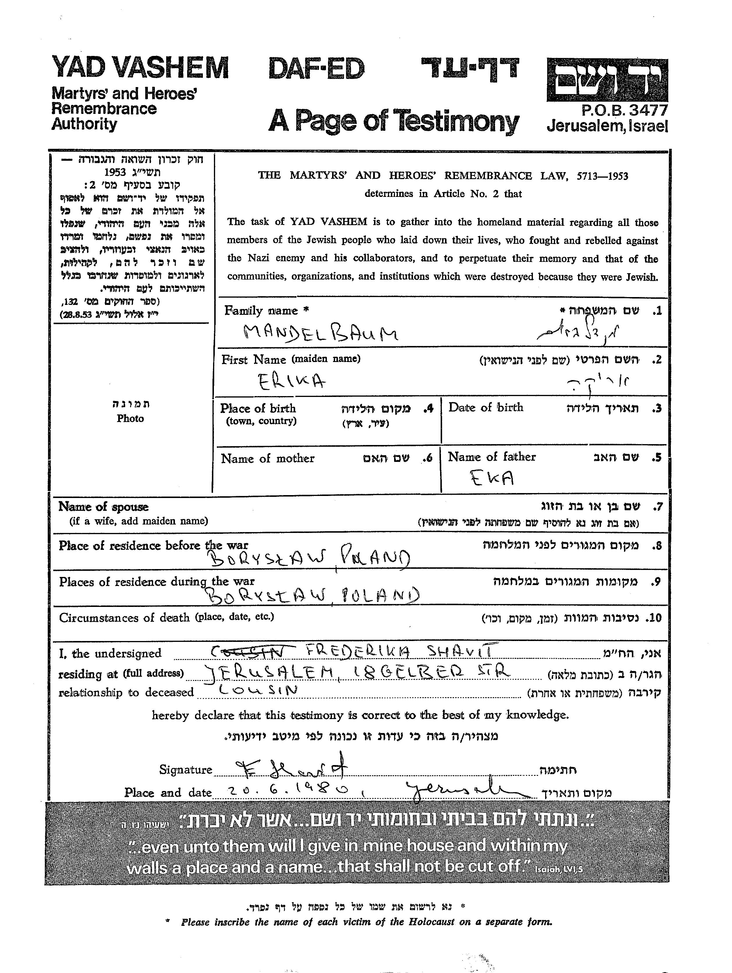 Mandelbaum Erika Boryslaw, Poland Page of Testimony