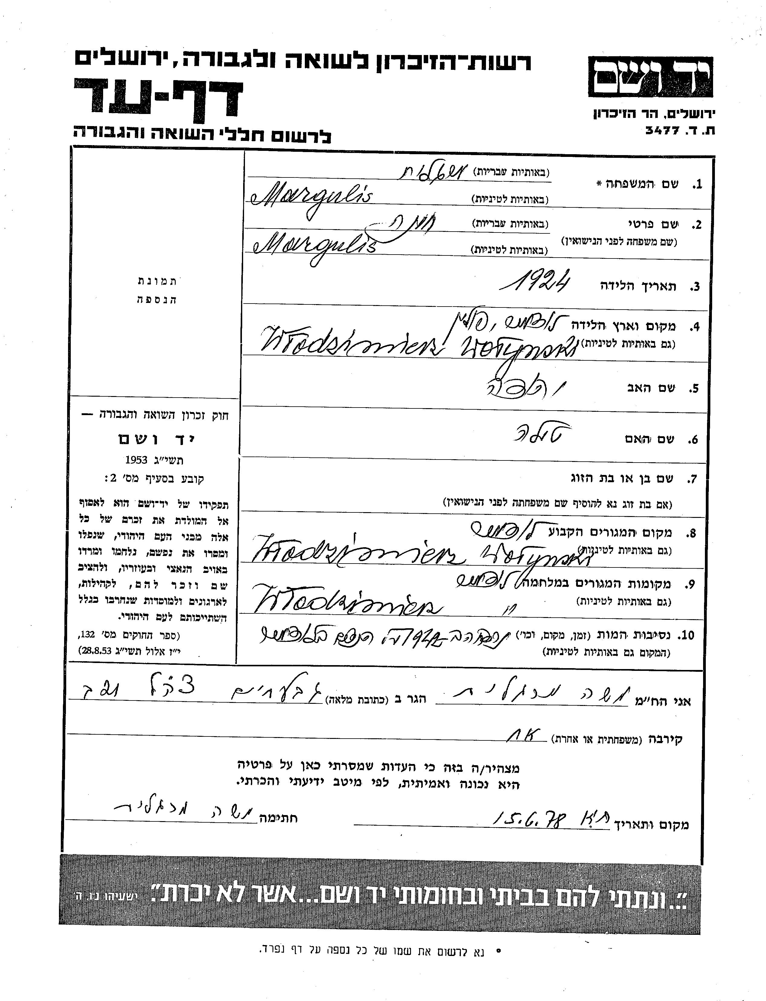 Margulis Khona 1924 Wlodzimierz, Poland Page of Testimony
