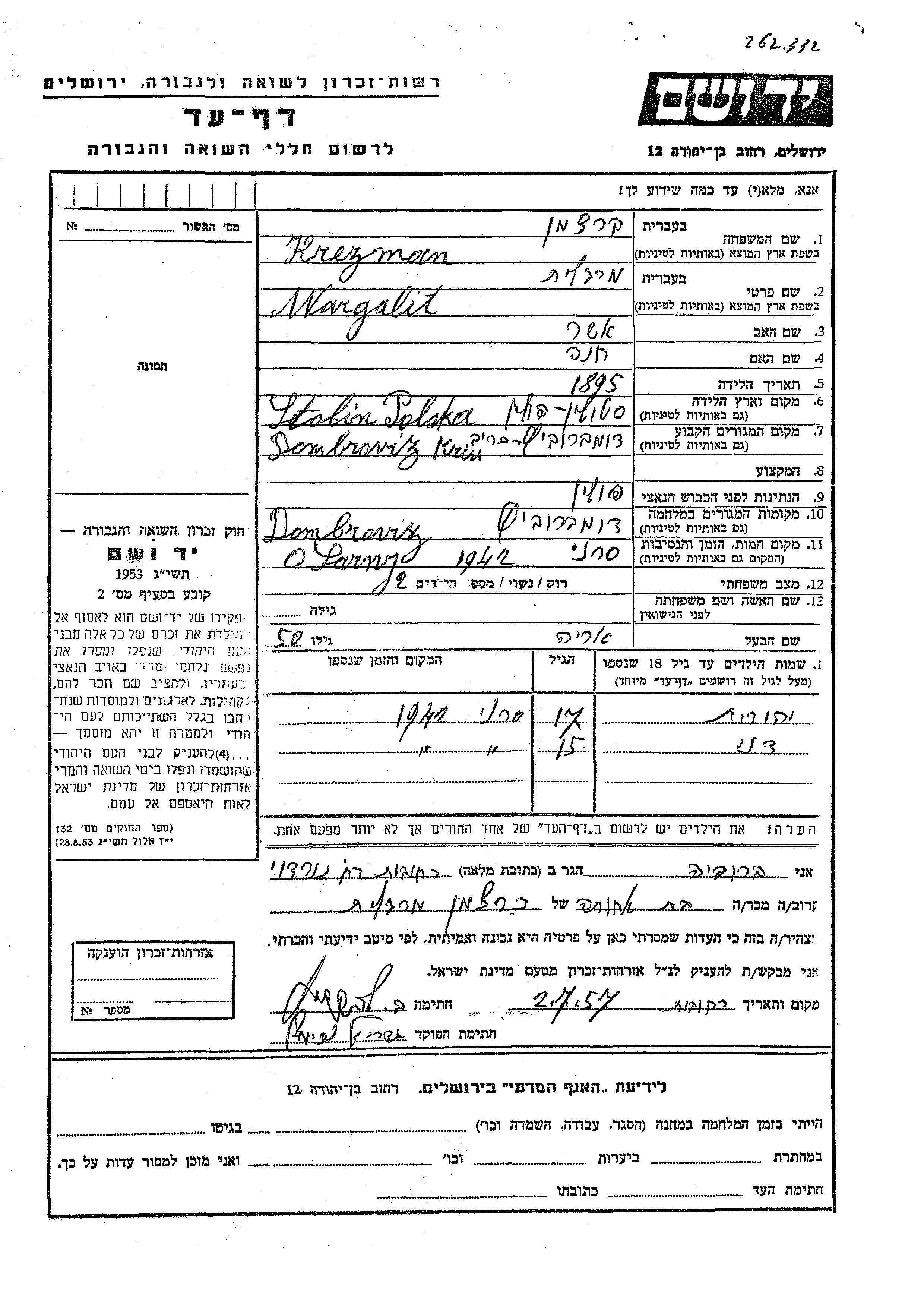 Krezman Yehudit Dombrovitz, Poland Page of Testimony