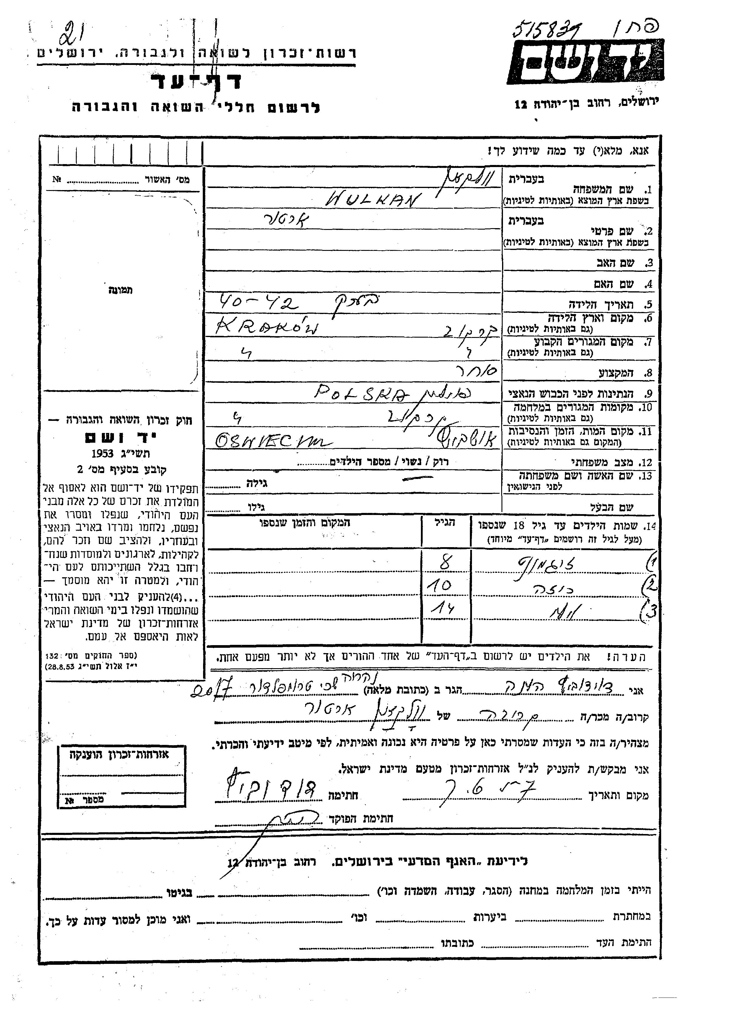 Wulkan Volken Artur Krakow, Poland Page of Testimony