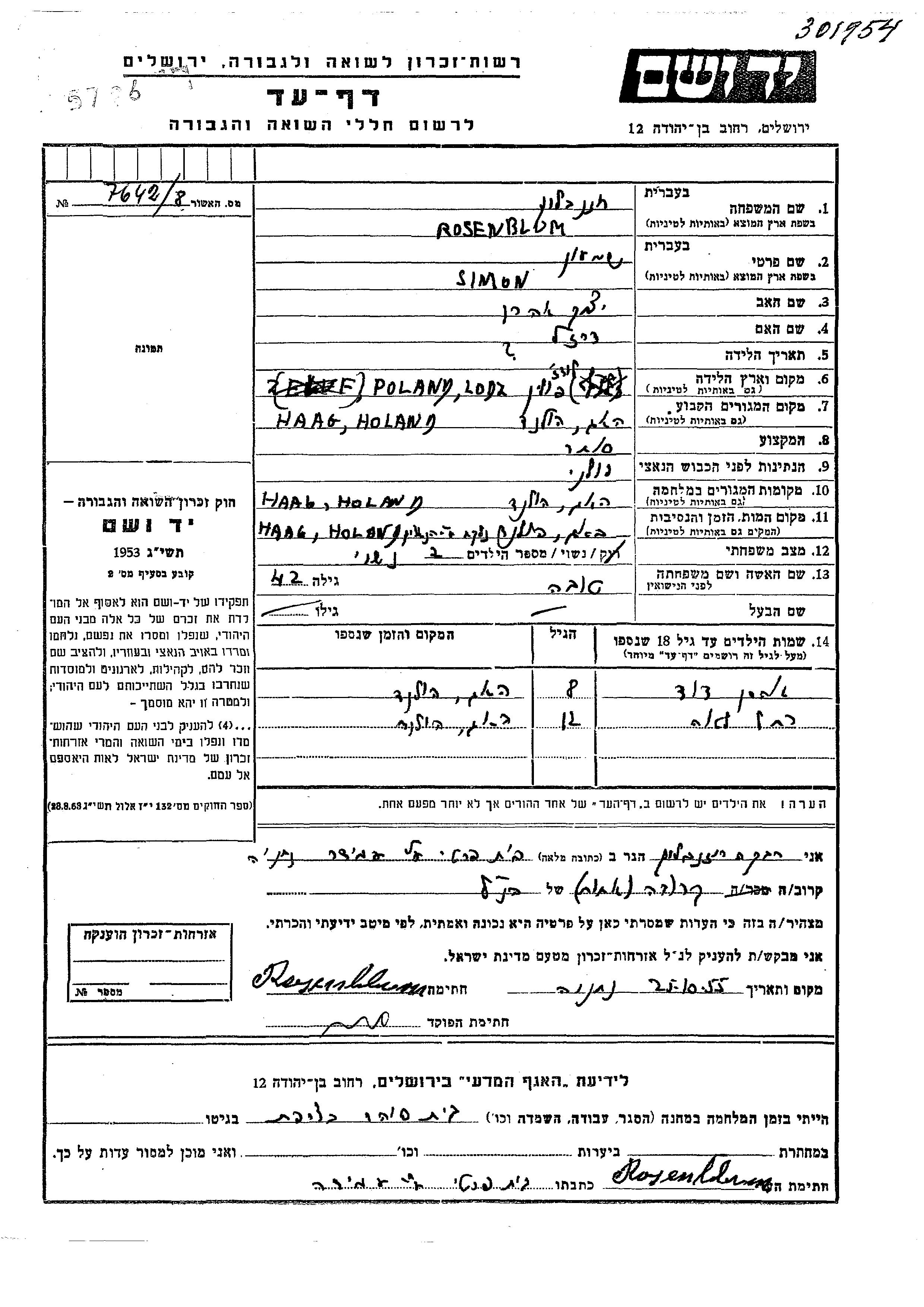Rosenblum Aharon David Hag, The Netherlands Page of Testimony