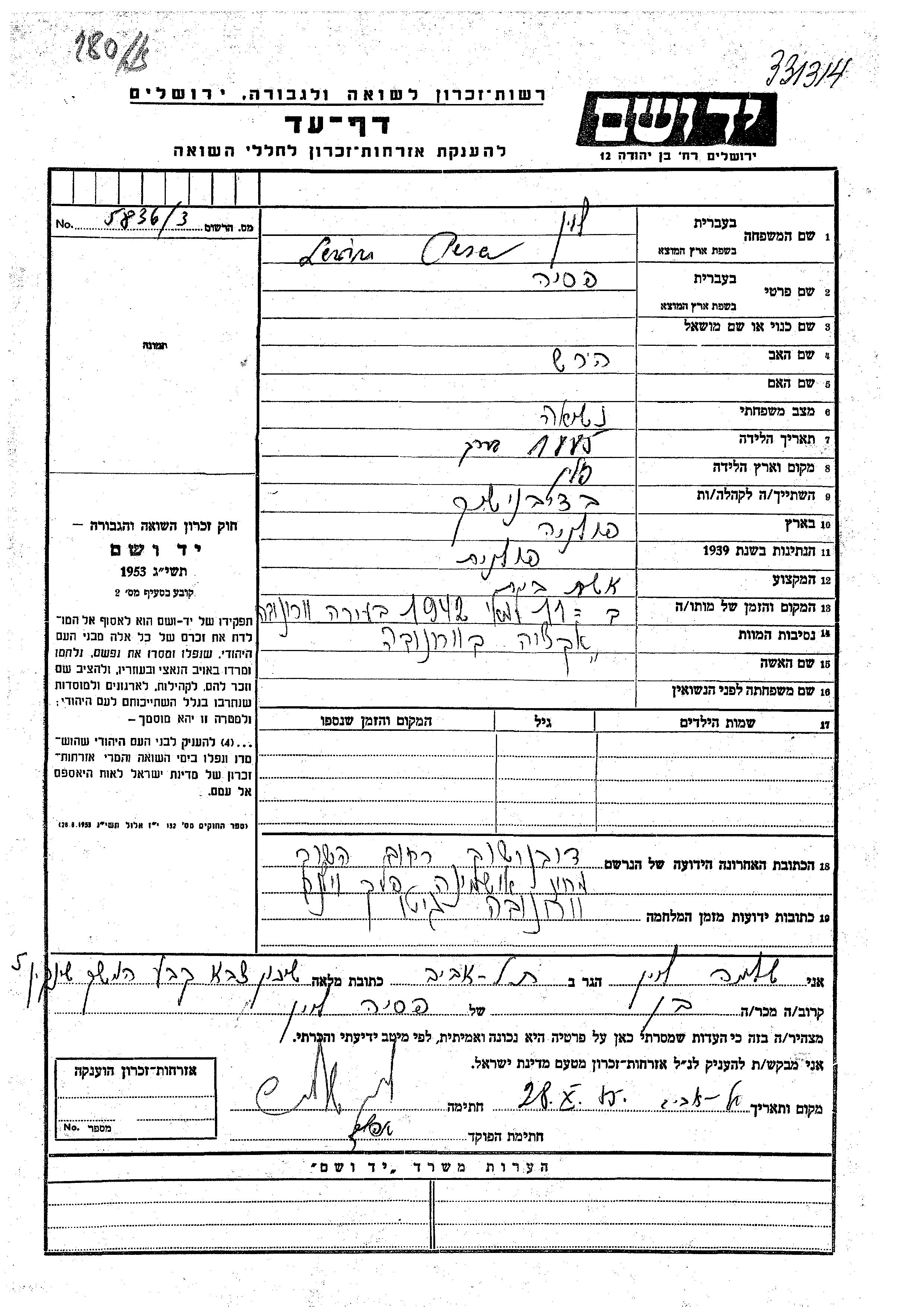 Pesa Pesia Levin was born in Poland, 1885 to Hirsh. She was a housewife and married. Prior to WWII she lived in Dziewieniszki, Poland. During the war she was in Woronowo, Poland. Pesa Pesia was murdered in the Shoah. Place of death: Woronowo, Poland, 11/05/1942.