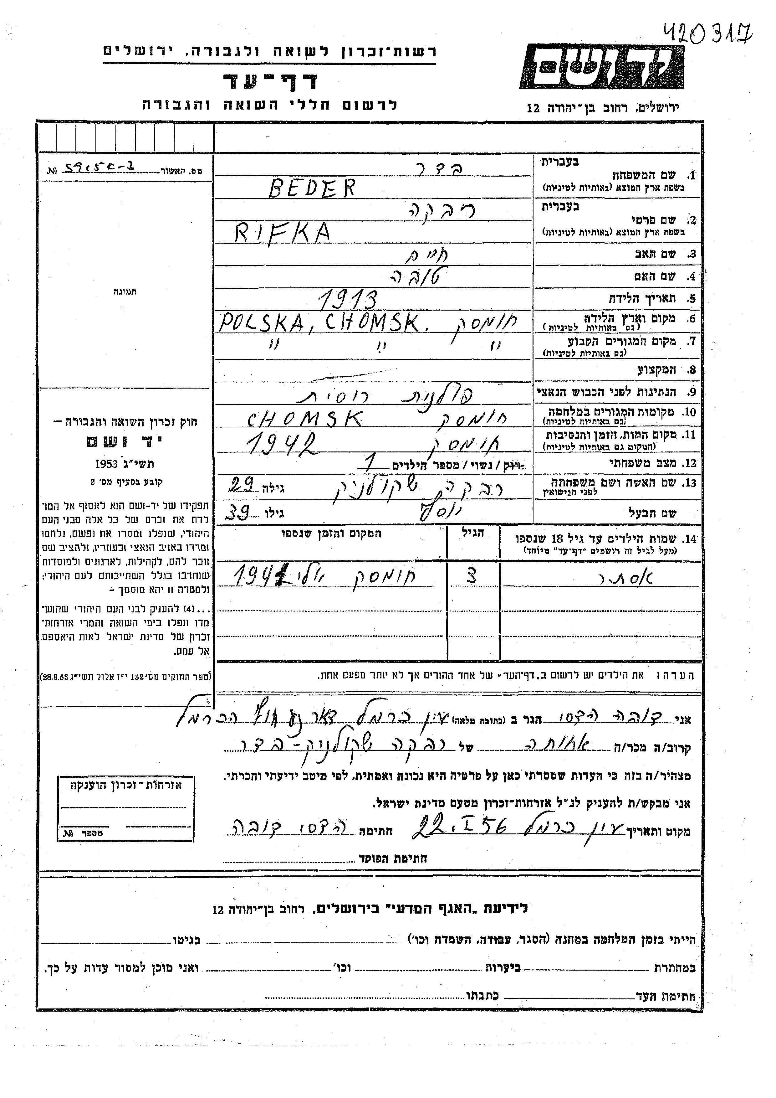 Ester Beder Bader was born to Yosef and Rifka nee Shkolnik. She was child. Prior to WWII she lived in Chomsk, Poland. During the war she was in Chomsk, Poland. Ester was murdered in the Shoah.