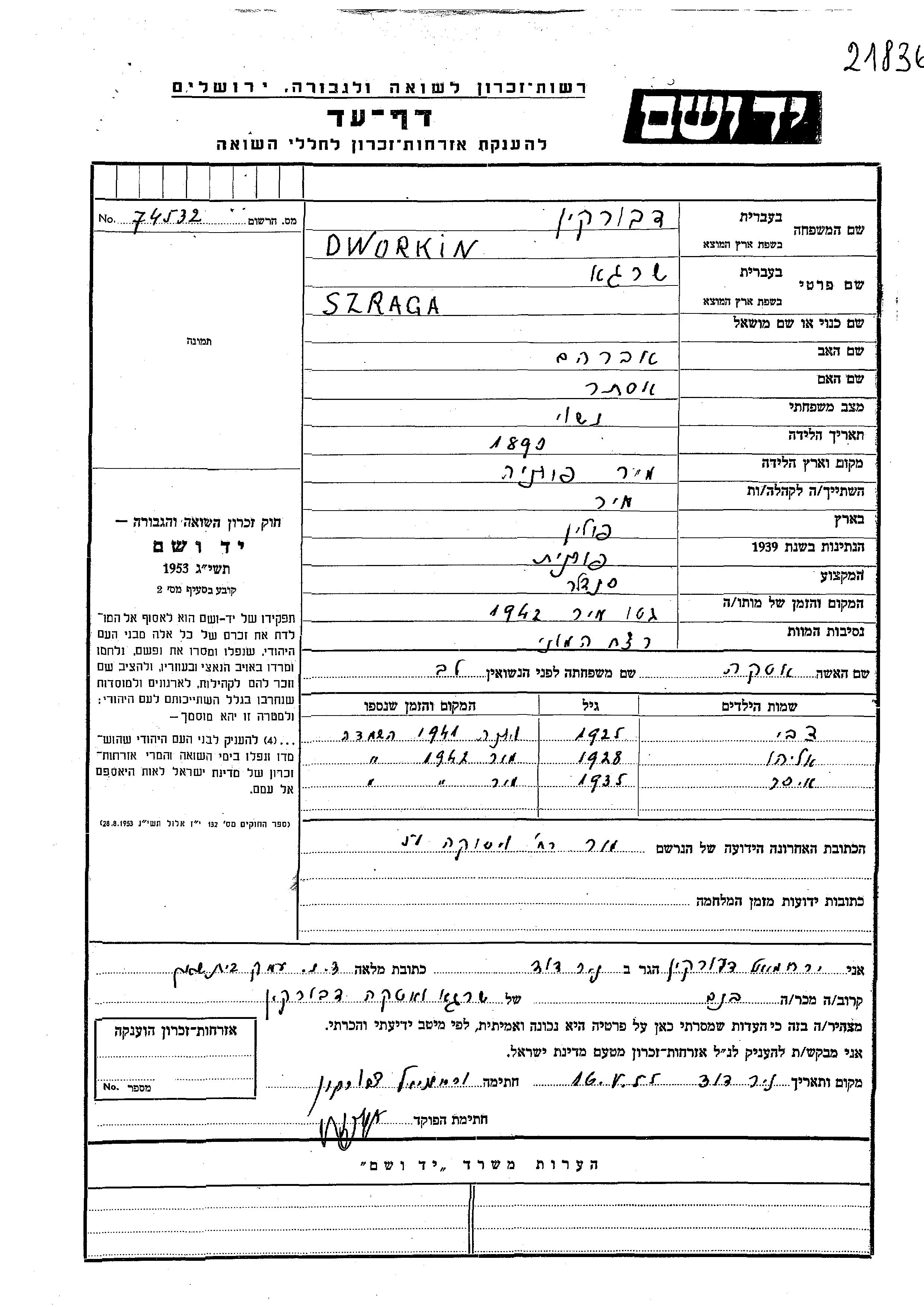 Dworkin Eliahu 1928 unstated place, Page of Testimony