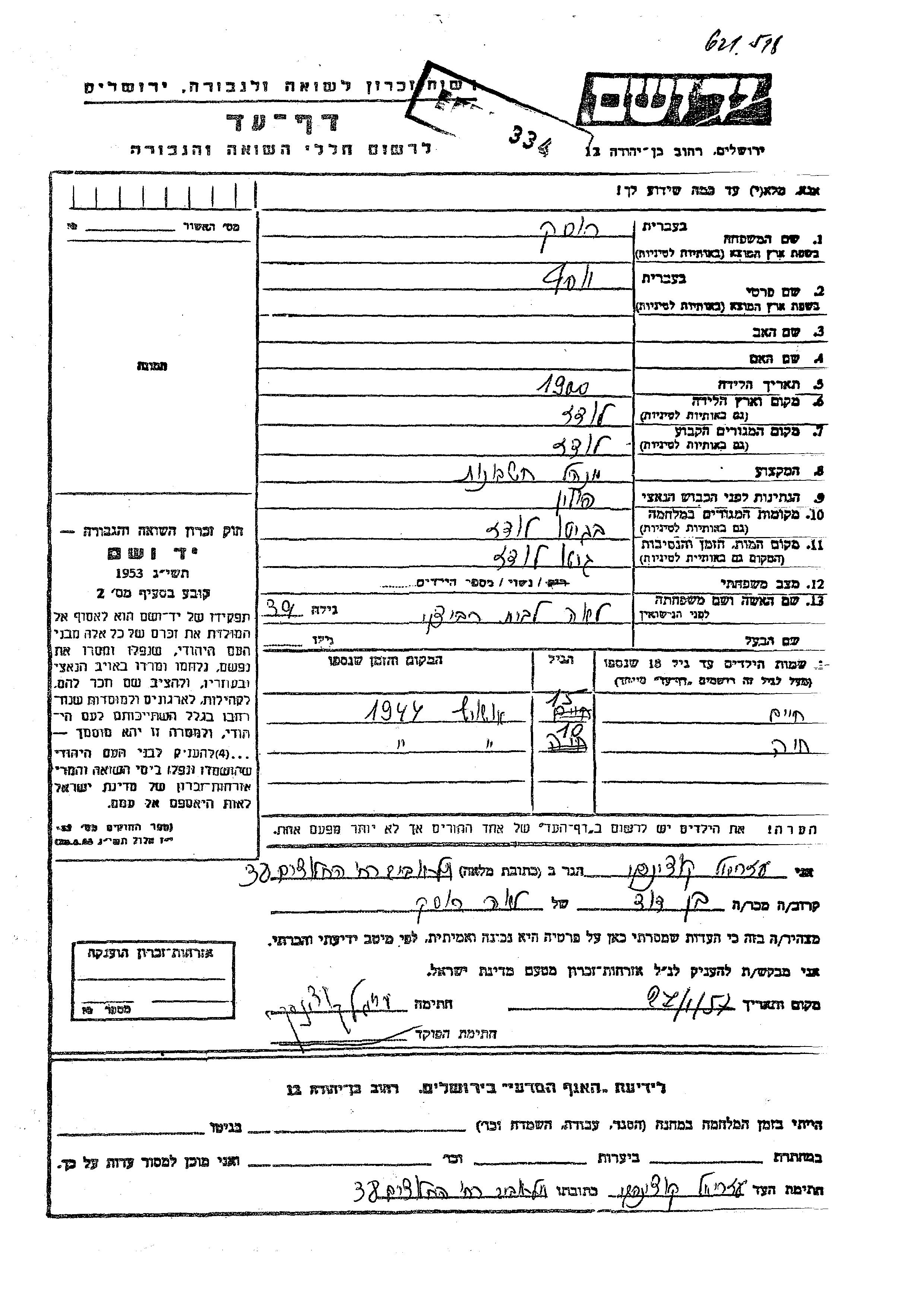 Yad Vashem - Pages of Testimony Names Memorial Collection