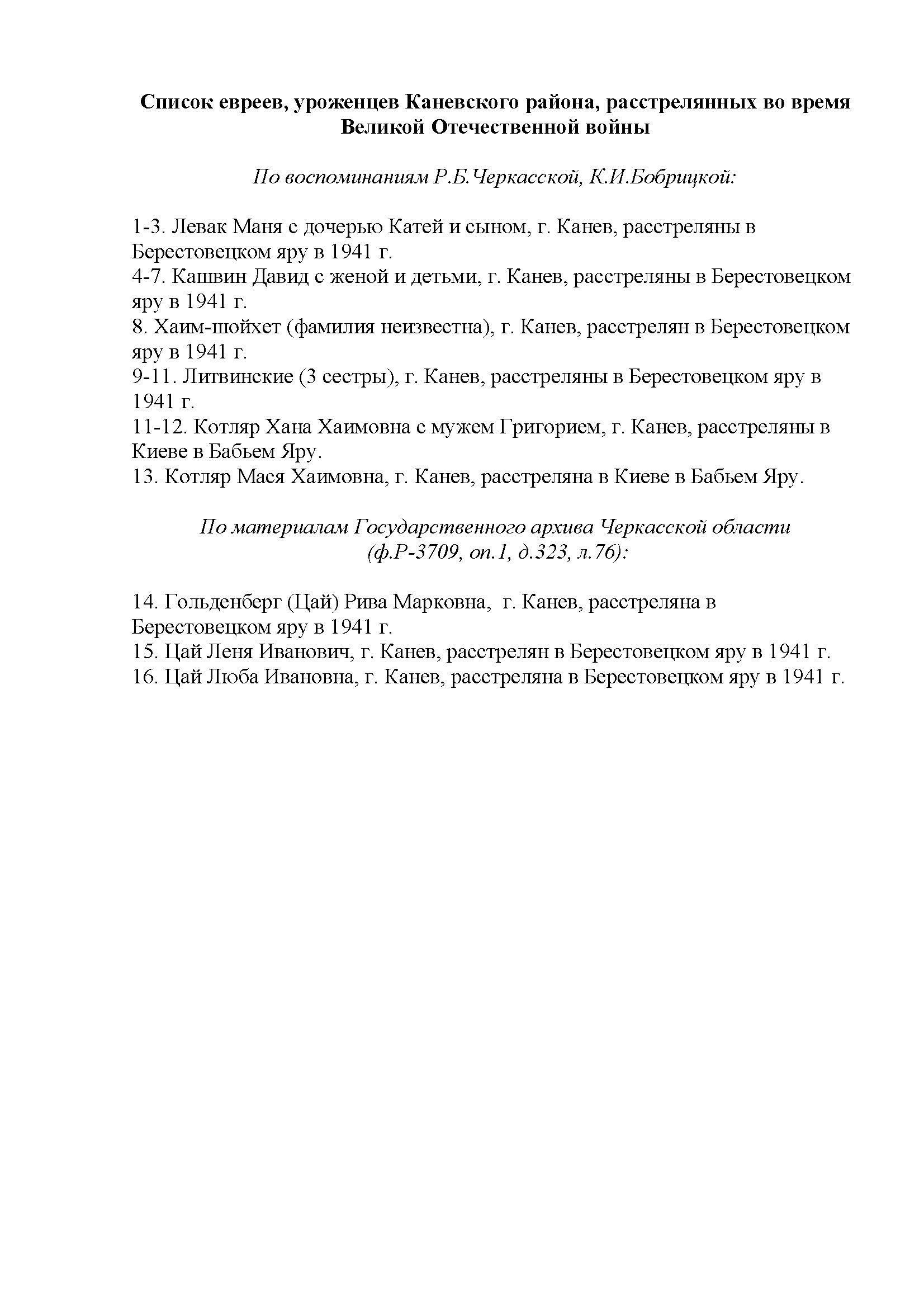 First name unknown Kashvin was born in Kanev, Ukraine (USSR). She was married to David. Prior to WWII she lived in Kanev, Ukraine (USSR). During the war she was in Kanev, Ukraine (USSR). She was murdered in the Shoah. Place of death: Berestovetskiy Yar (Kanev Area), Ukraine (USSR), 1941.