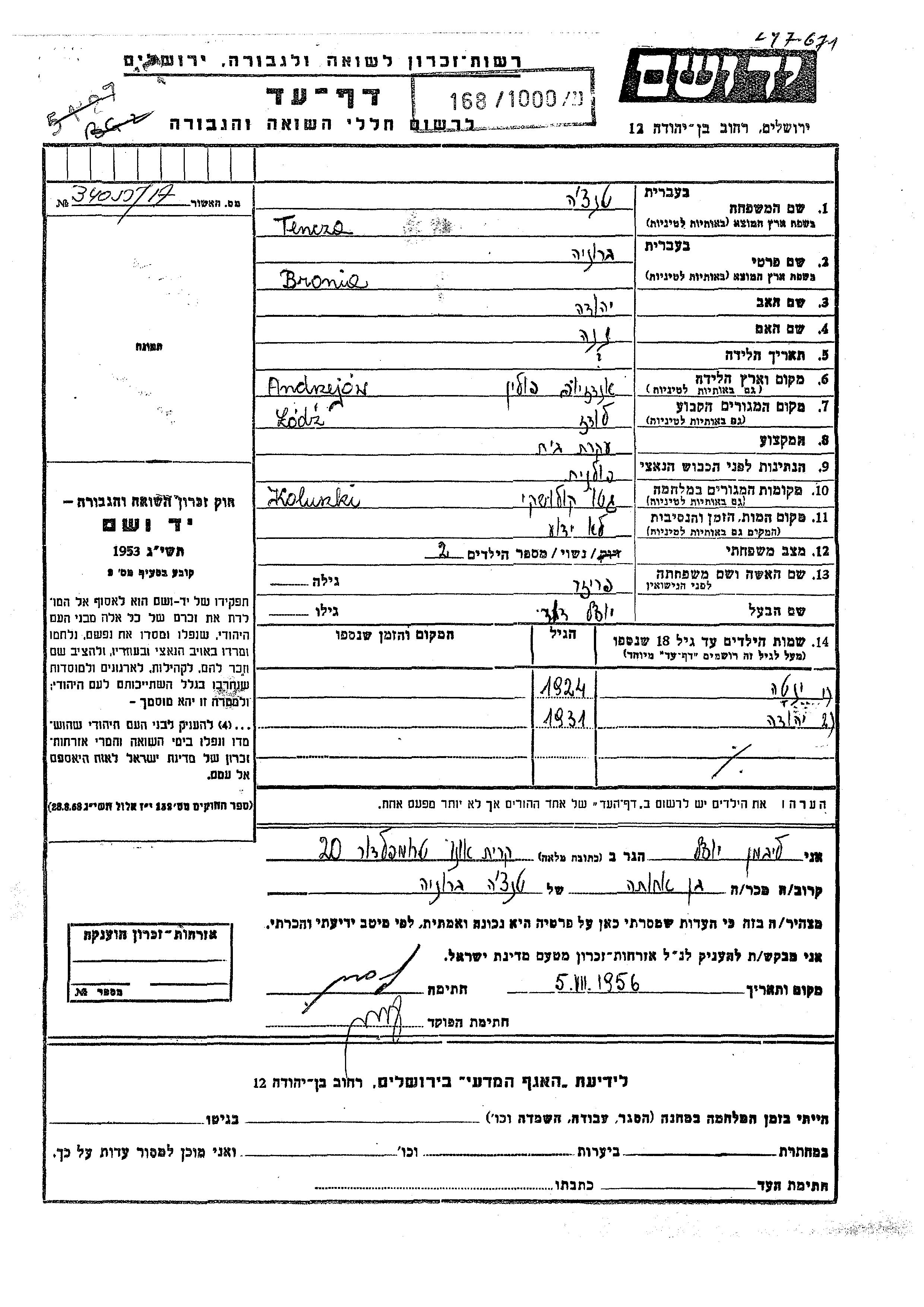 Bronia Tencza nee Parizer was born in Andrzejow, Poland to Yehuda and Nena. She was a housewife and married to Yosef David. Prior to WWII she lived in Lodz, Poland. During the war she was in Koluszki, Poland. Bronia was murdered in the Shoah.