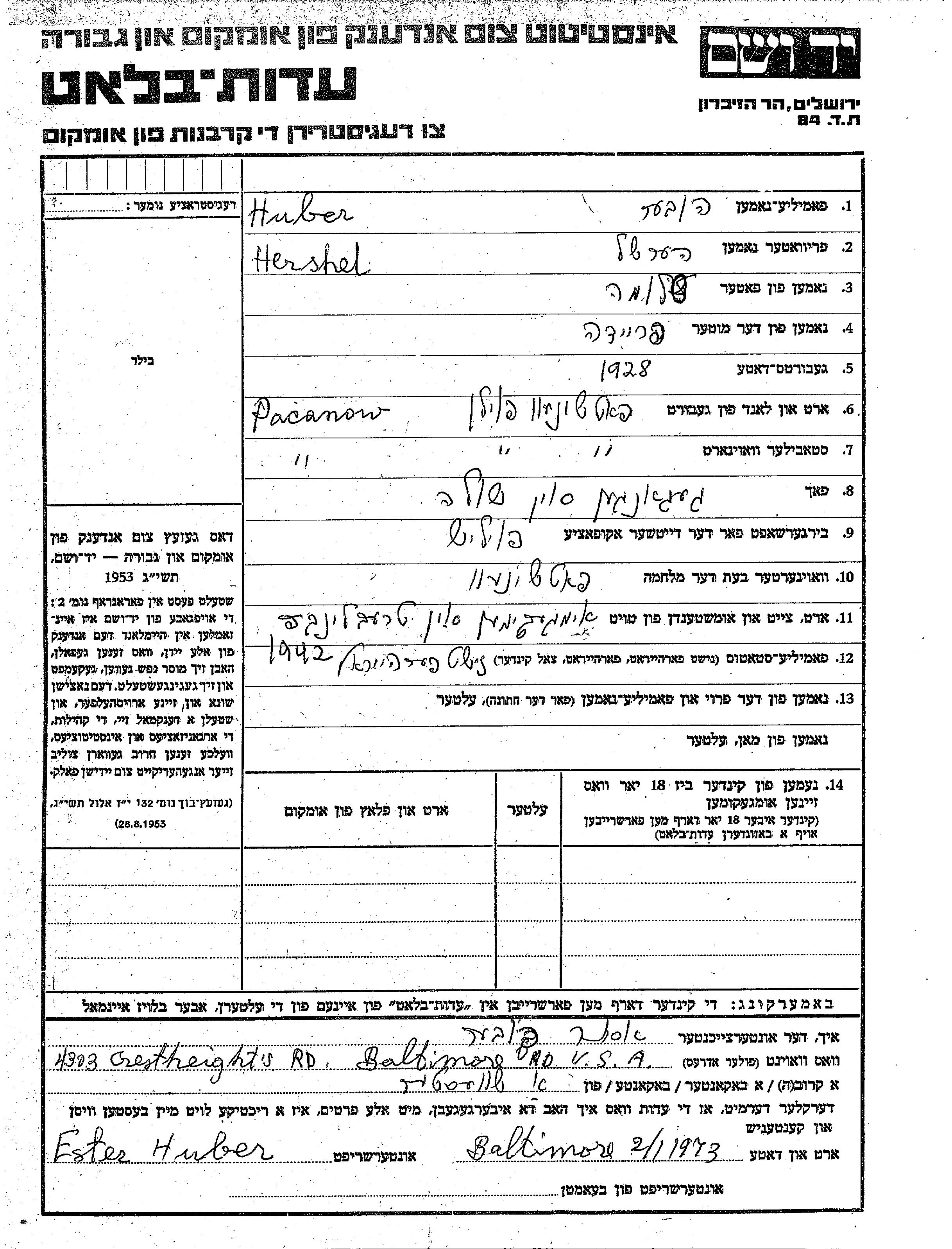 Huber Hershel 1928 Pacanow, Poland Page of Testimony