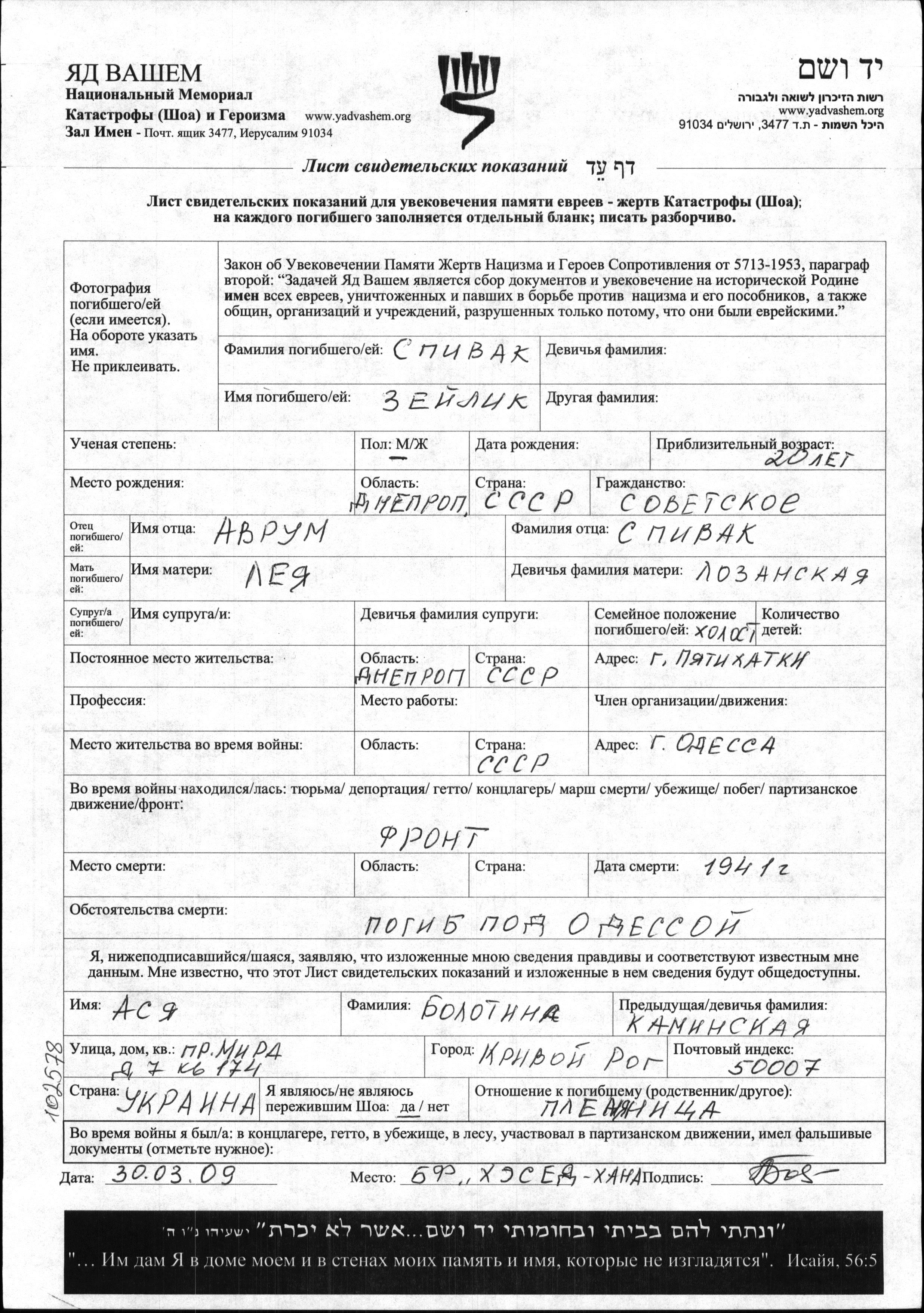 Zeilik Spivak was born in Dnepropetrovsk, Ukraine (USSR) to Avrum and Leya nee Lozanskaya. He was single. Prior to WWII he lived in Pyatikhatki, Ukraine (USSR). During the war he was in the Soviet armed forces. Zeilik was killed in military service in WWII. Place of death: Odessa, Ukraine (USSR), 1941.