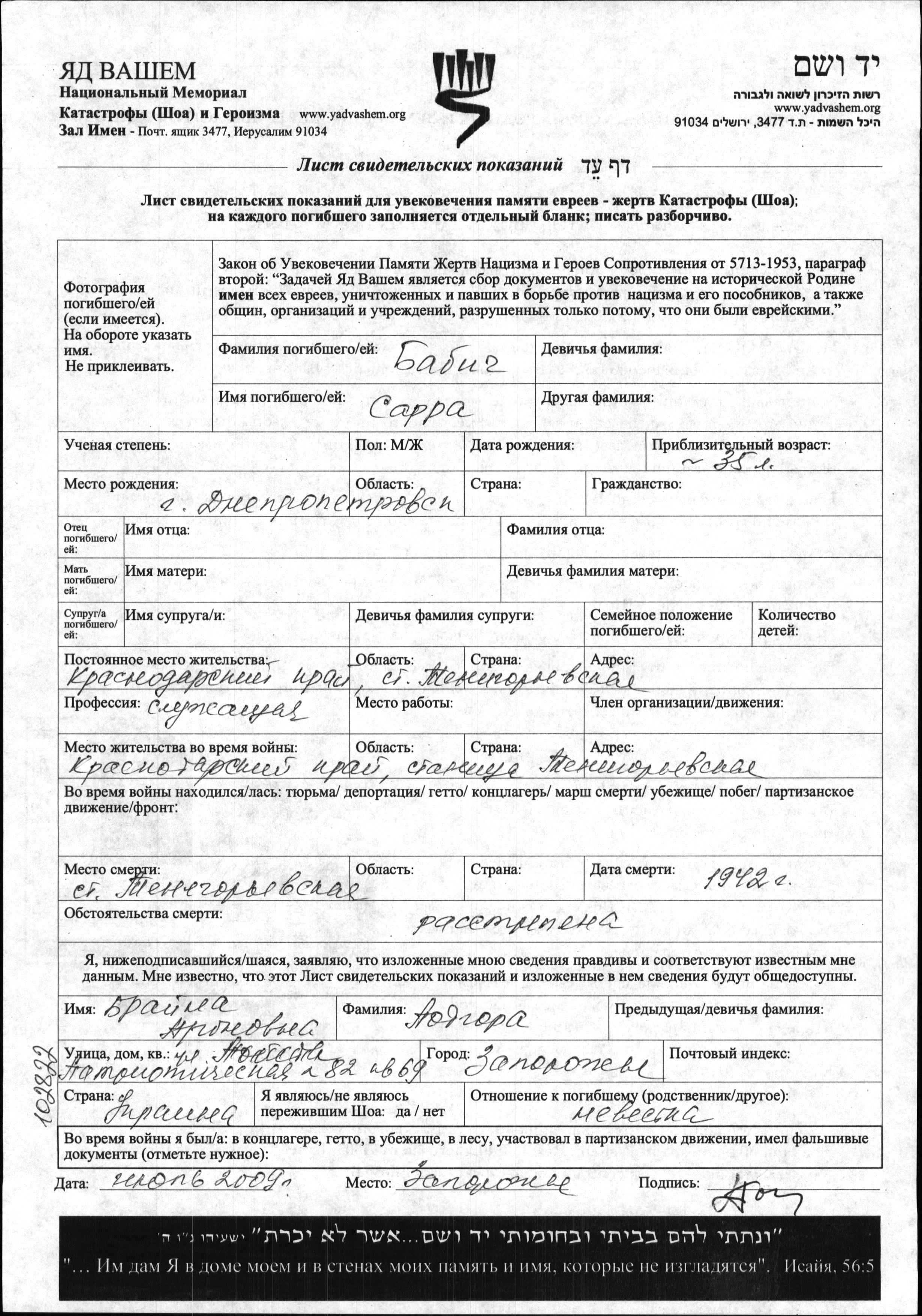 Sarra Babich was born in Dnepropetrovsk, Ukraine (USSR). She was an employee. Prior to WWII she lived in Temirgoyevskaya, Russia (USSR). During the war she was in Temirgoyevskaya, Russia (USSR). Sarra was murdered in the Shoah. Place of death: Temirgoyevskaya, Russia (USSR), 1942.