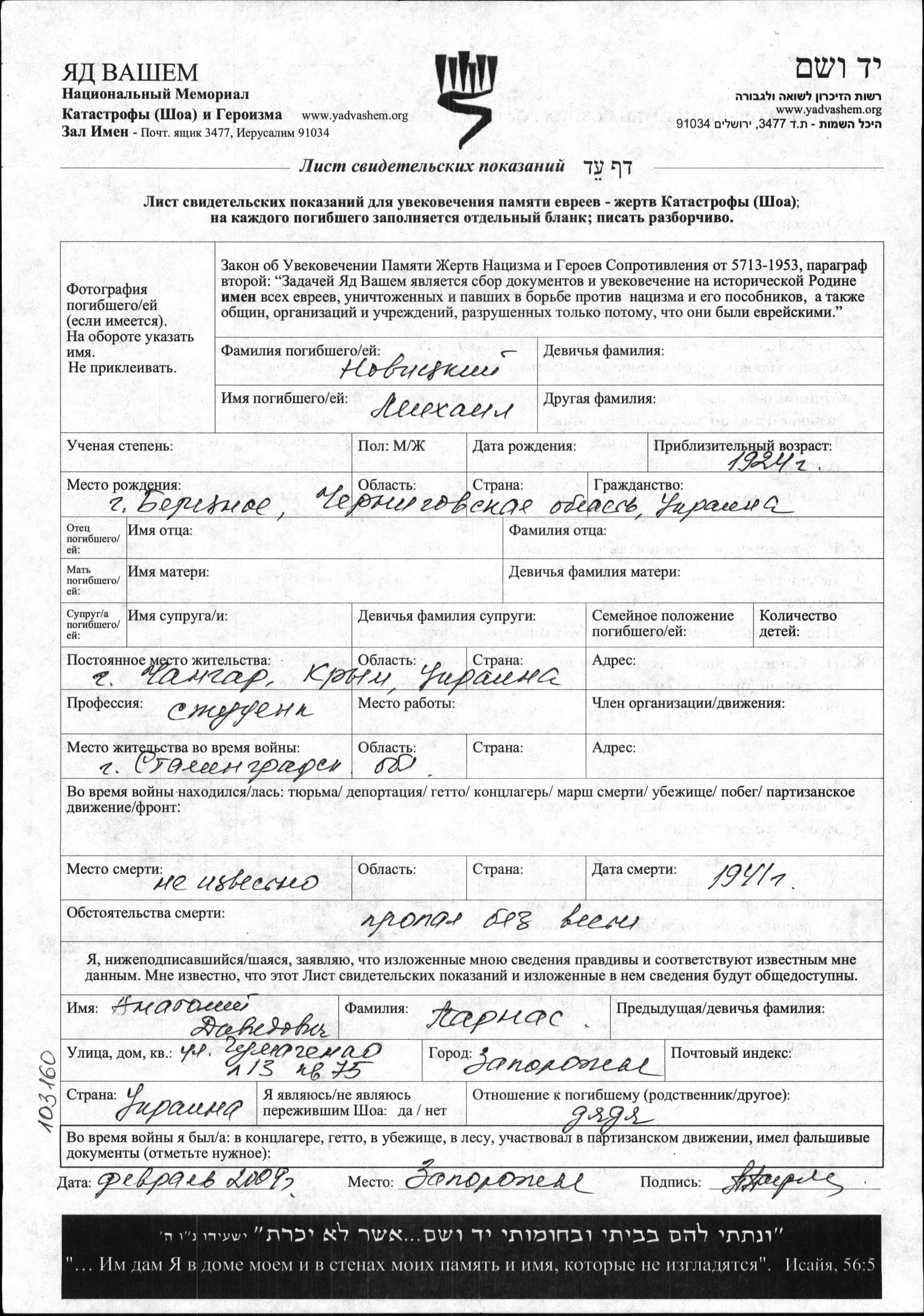 Novitzkiy Mikhail 1924 Chongar, Ukraine (USSR) Page of Testimony