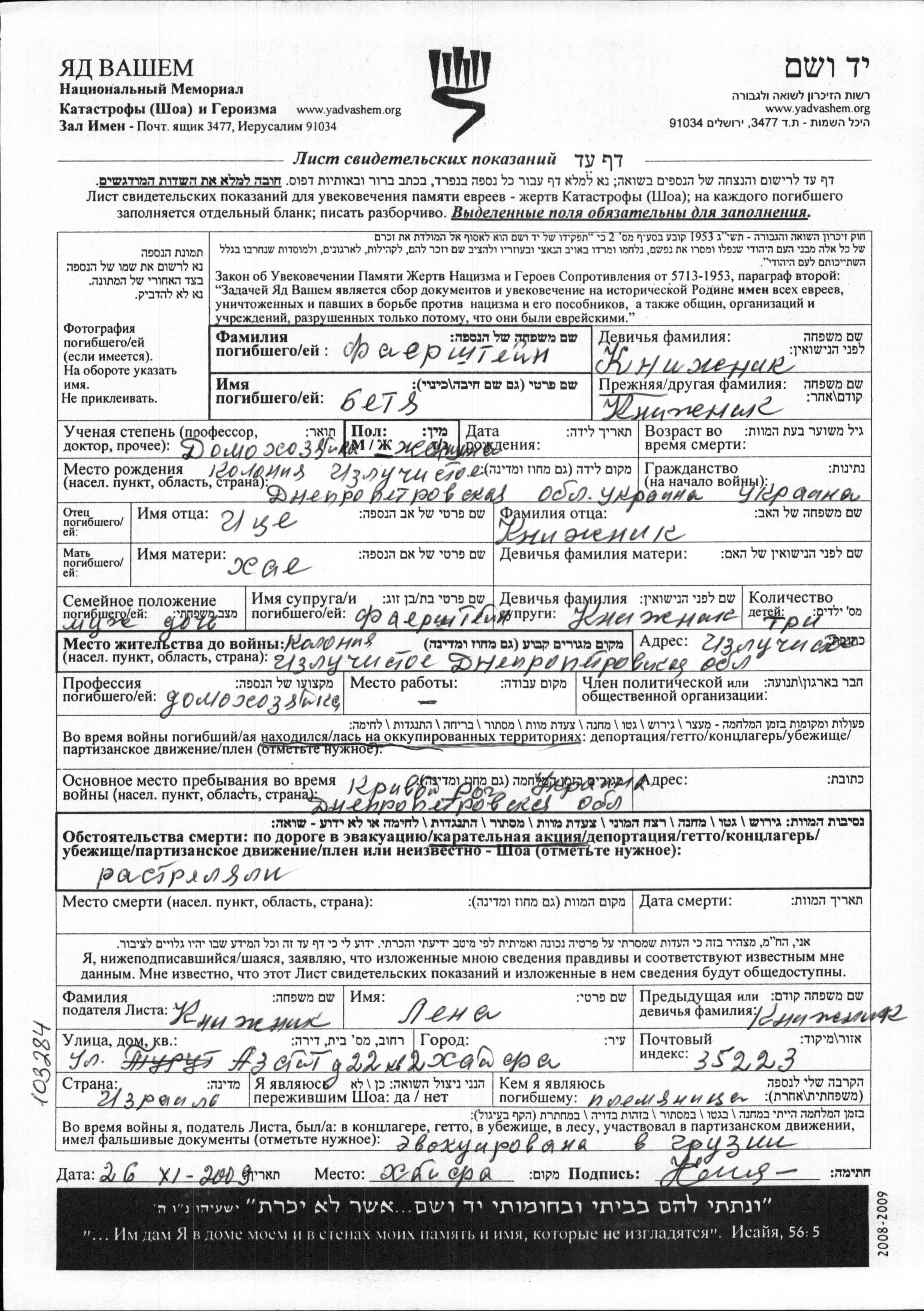 Betya Faershtein nee Knizhnik was born in Izluchistoye, Ukraine (USSR) to Itze and Khae. She was a housewife and married. Prior to WWII she lived in Izluchistoye, Ukraine (USSR). During the war she was in Krivoy Rog, Ukraine (USSR). Betya was murdered in the Shoah.