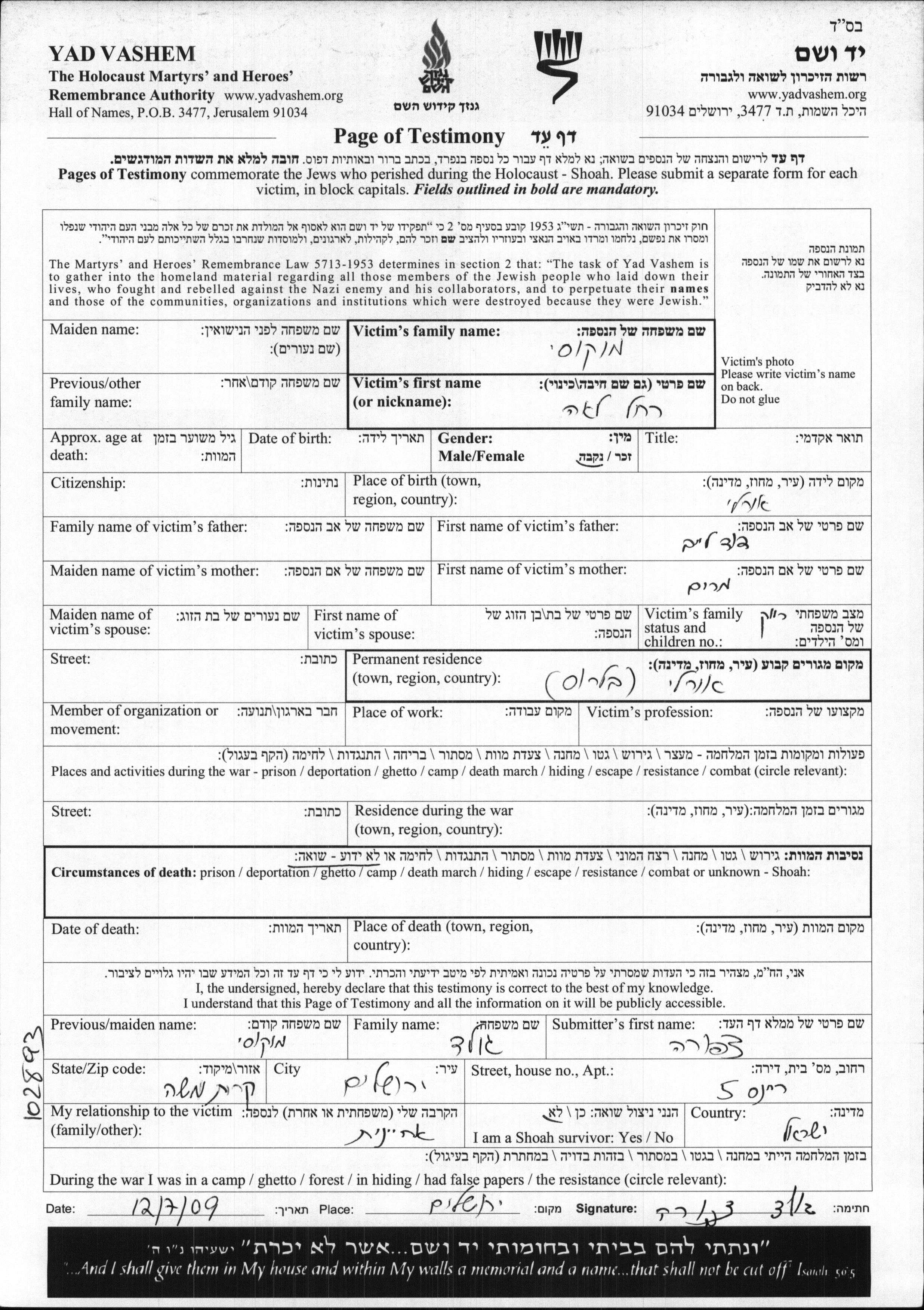Yad Vashem - Pages of Testimony Names Memorial Collection