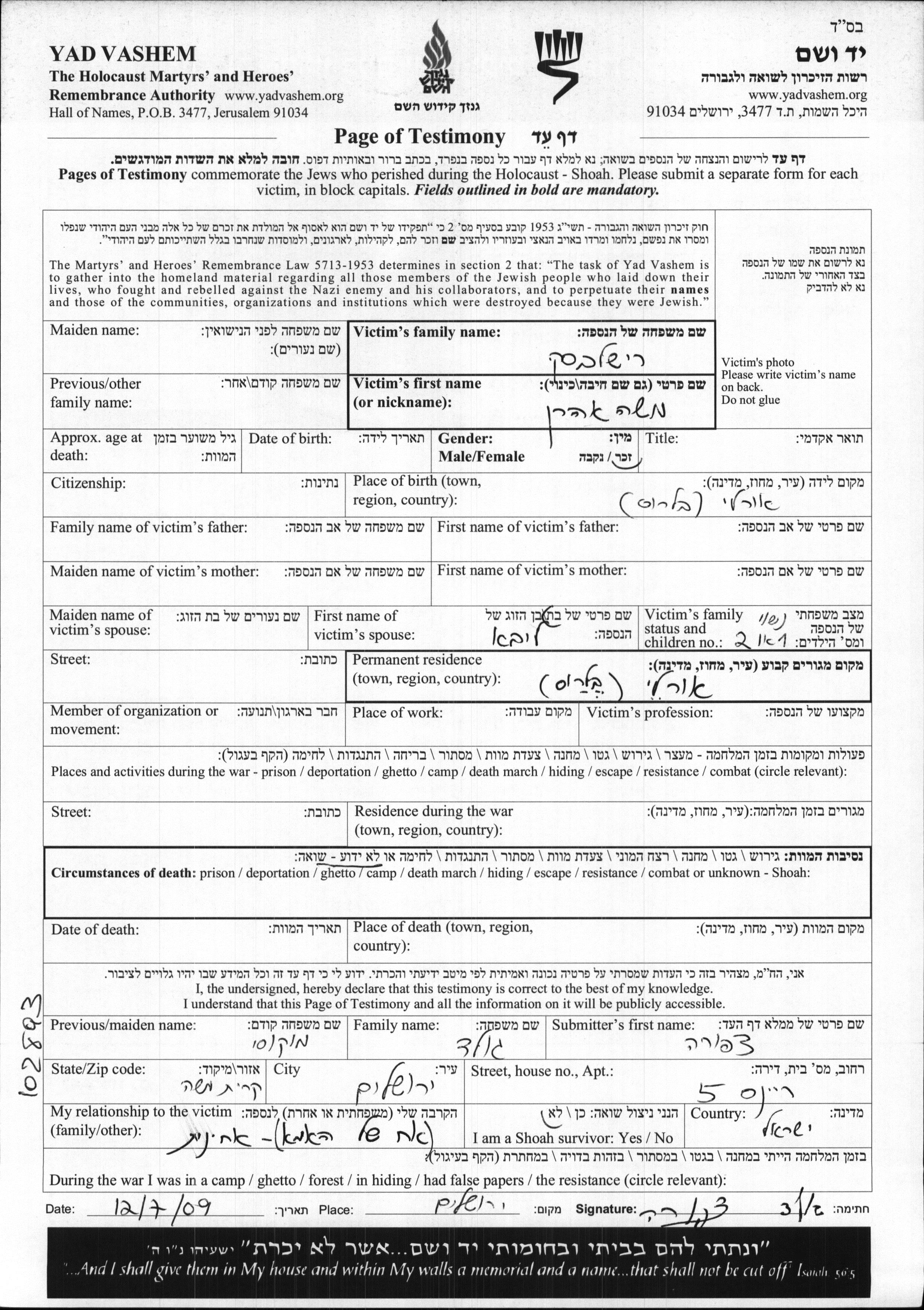 רישלבסקי Moshe Aharon Orly, Poland Page of Testimony