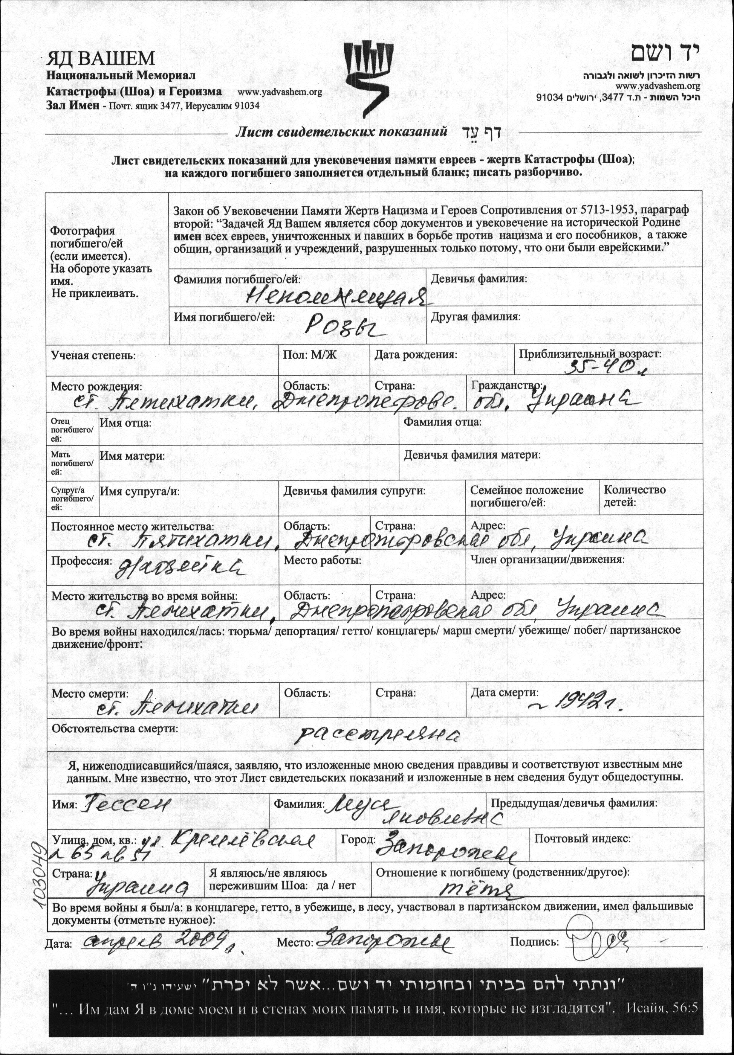 Rozy Nepomnyashchaya was born in Pyatikhatki, Ukraine (USSR). She was a housewife. Prior to WWII she lived in Pyatikhatki, Ukraine (USSR). During the war she was in Pyatikhatki, Ukraine (USSR). Rozy was murdered in the Shoah. Place of death: Pyatikhatki, Ukraine (USSR), 1942.
