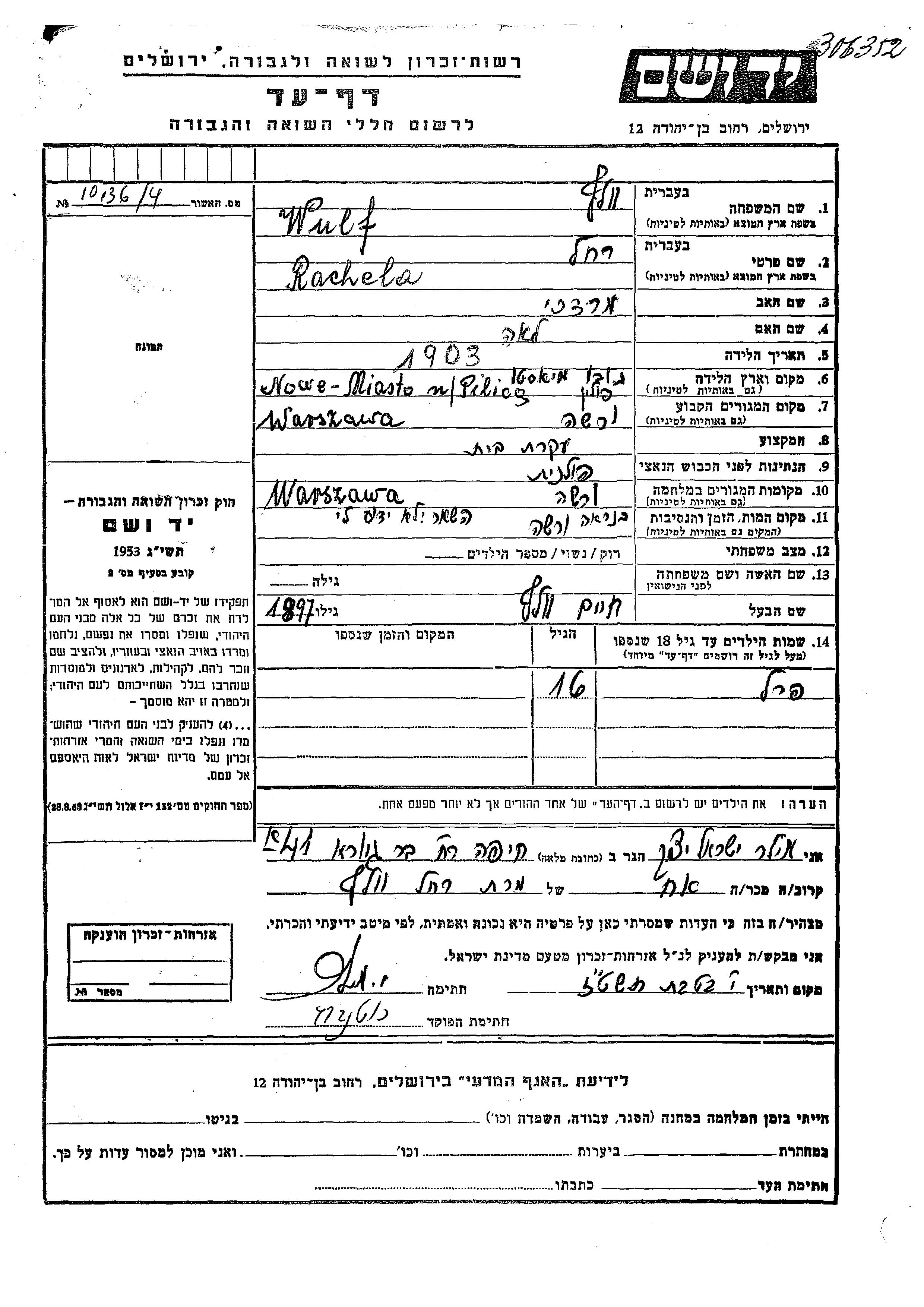 Rachela Wulf was born in Nowe Miasto nad Pilica, Poland, 1903 to Mordekhai and Lea. She was a housewife and married to Khaim. Prior to WWII she lived in Warsaw, Poland. During the war she was in Warsaw, Poland. Rachela was murdered in the Shoah. Place of death: Warsaw, Poland.