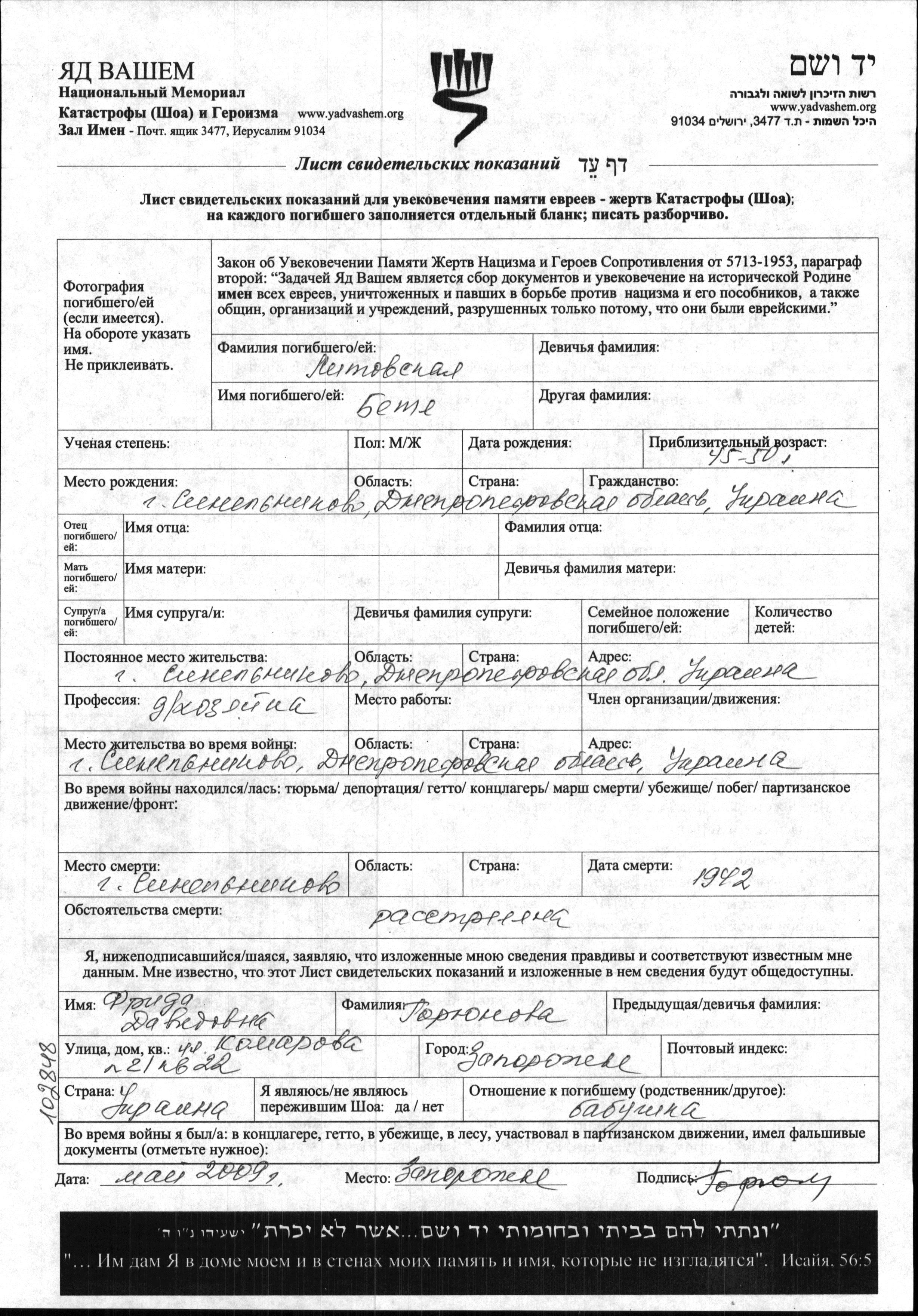 Litovskaya Betya Sinelnikovo, Ukraine (USSR) Page of Testimony