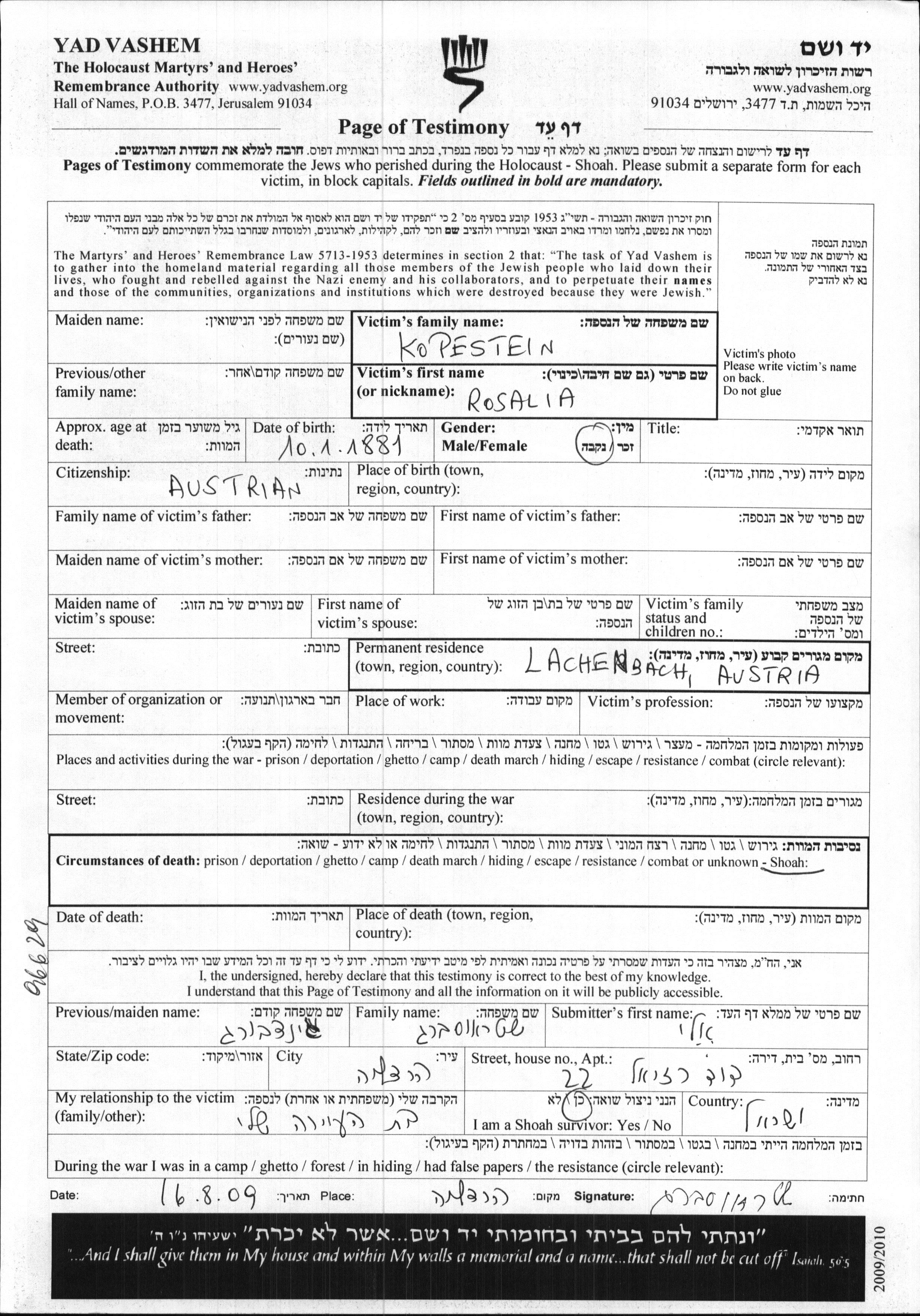 Kopestein Rosalia 1881 Lackenbach, Austria Page of Testimony