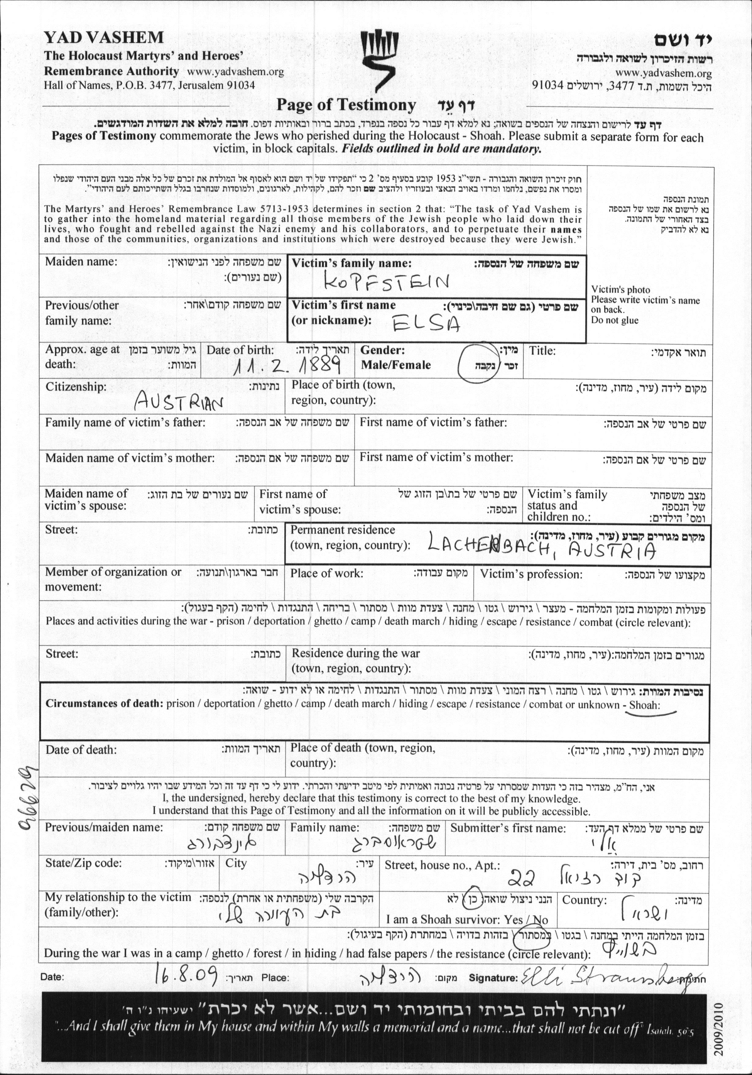 Kopfstein Elsa 1889 Markeutsy, Romania Page of Testimony
