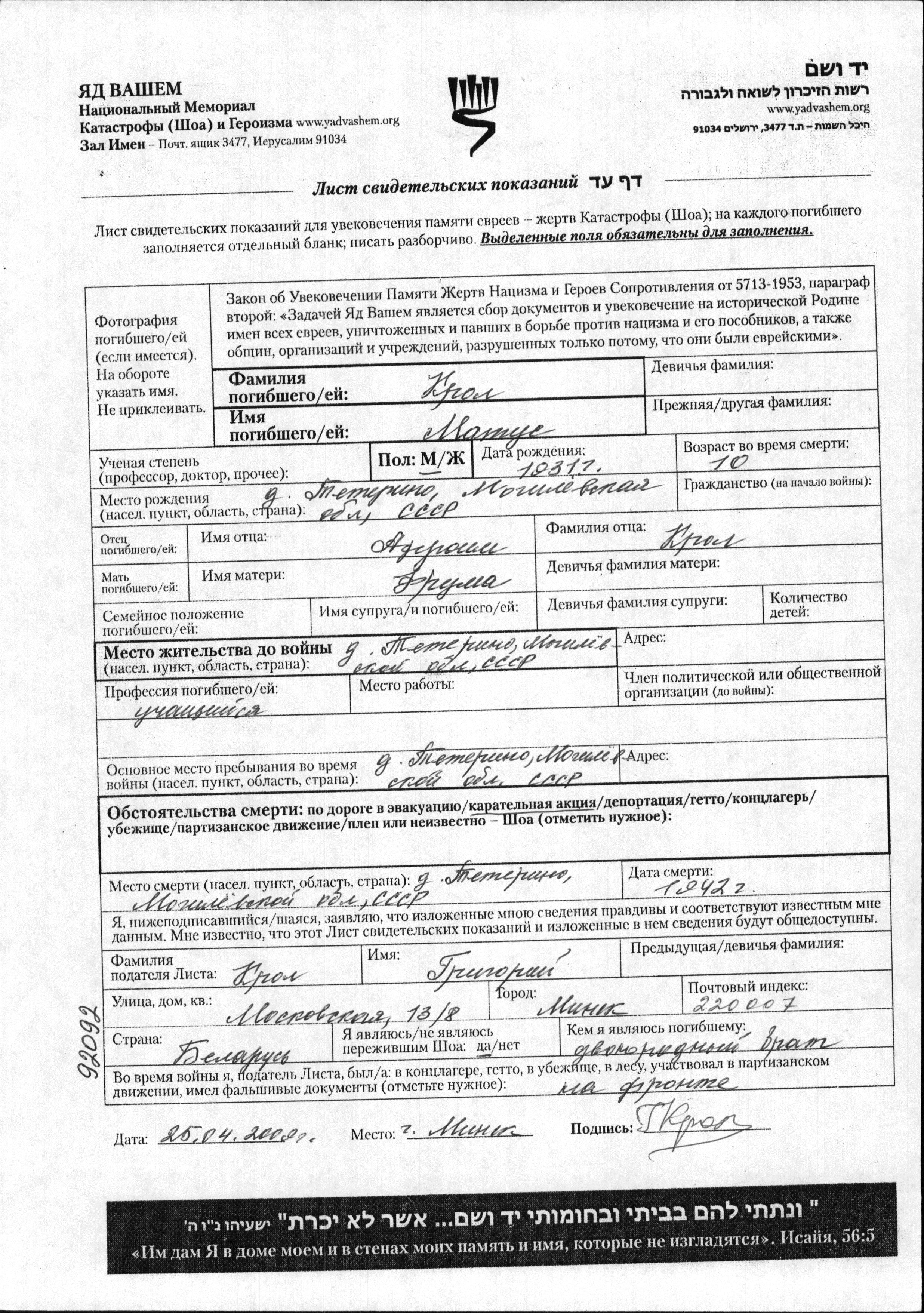 Krol Matus 1931 Teterin, Belorussia (USSR) Page of Testimony