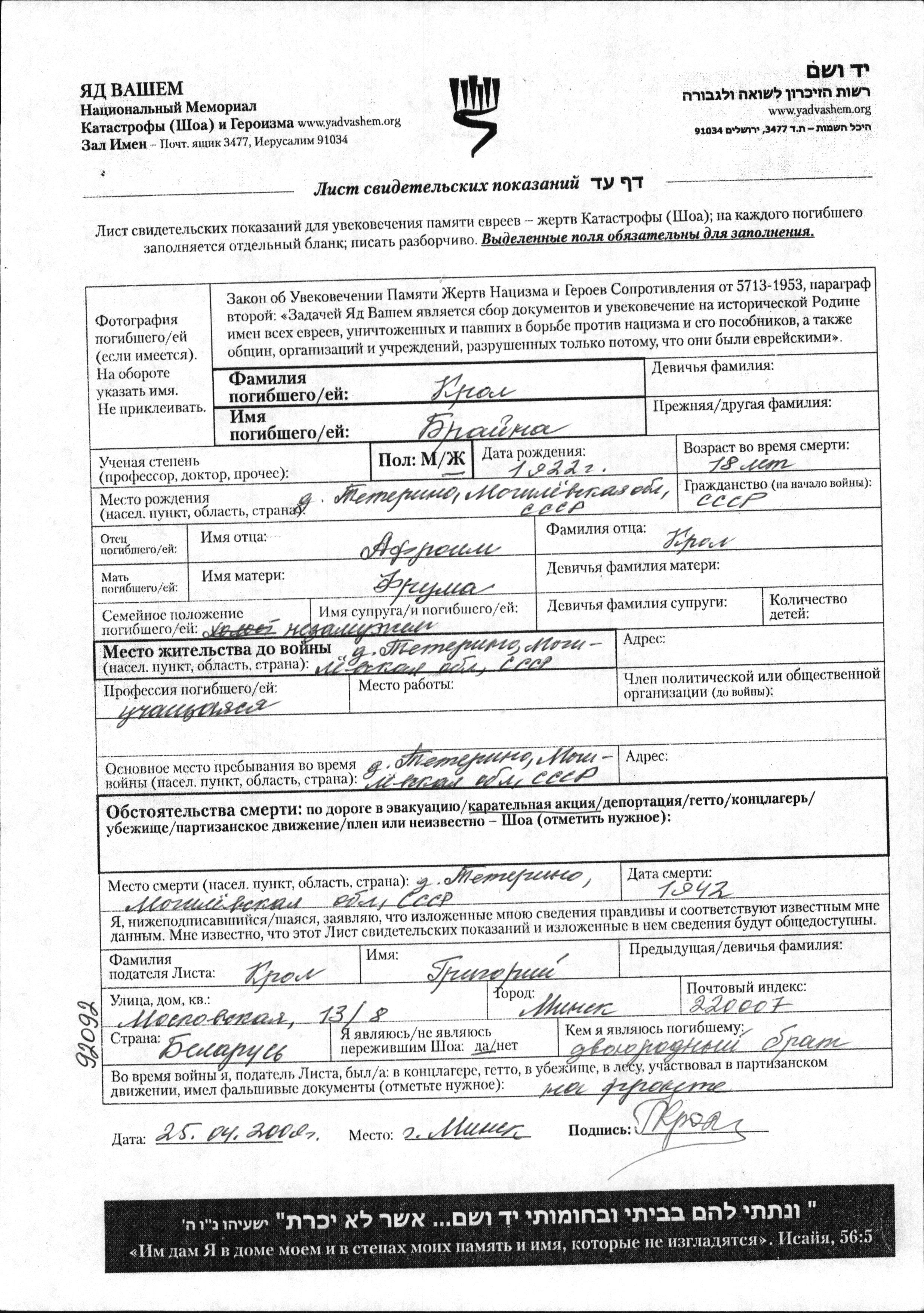 Yad Vashem - Pages of Testimony Names Memorial Collection
