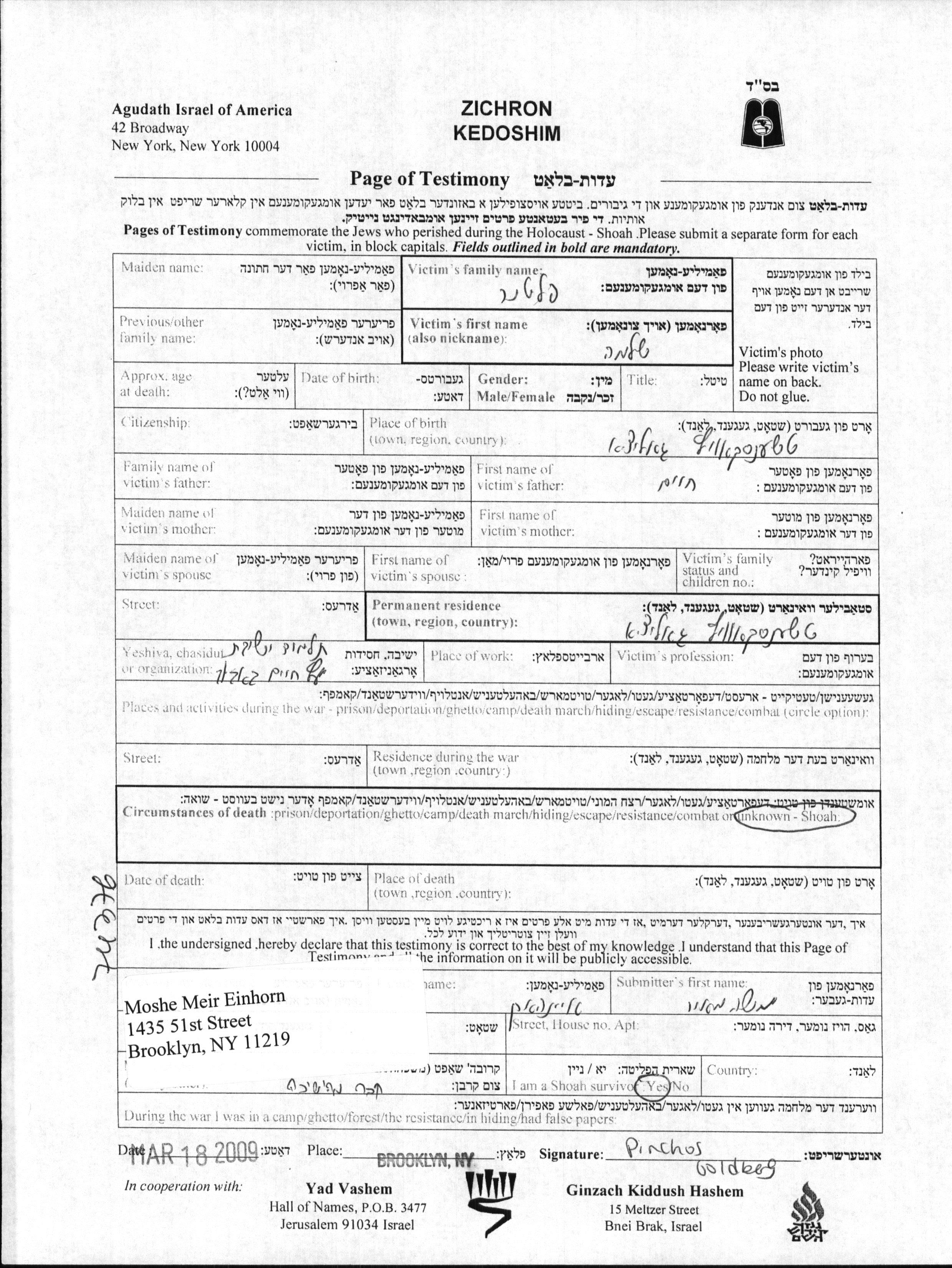 Yad Vashem - Pages of Testimony Names Memorial Collection