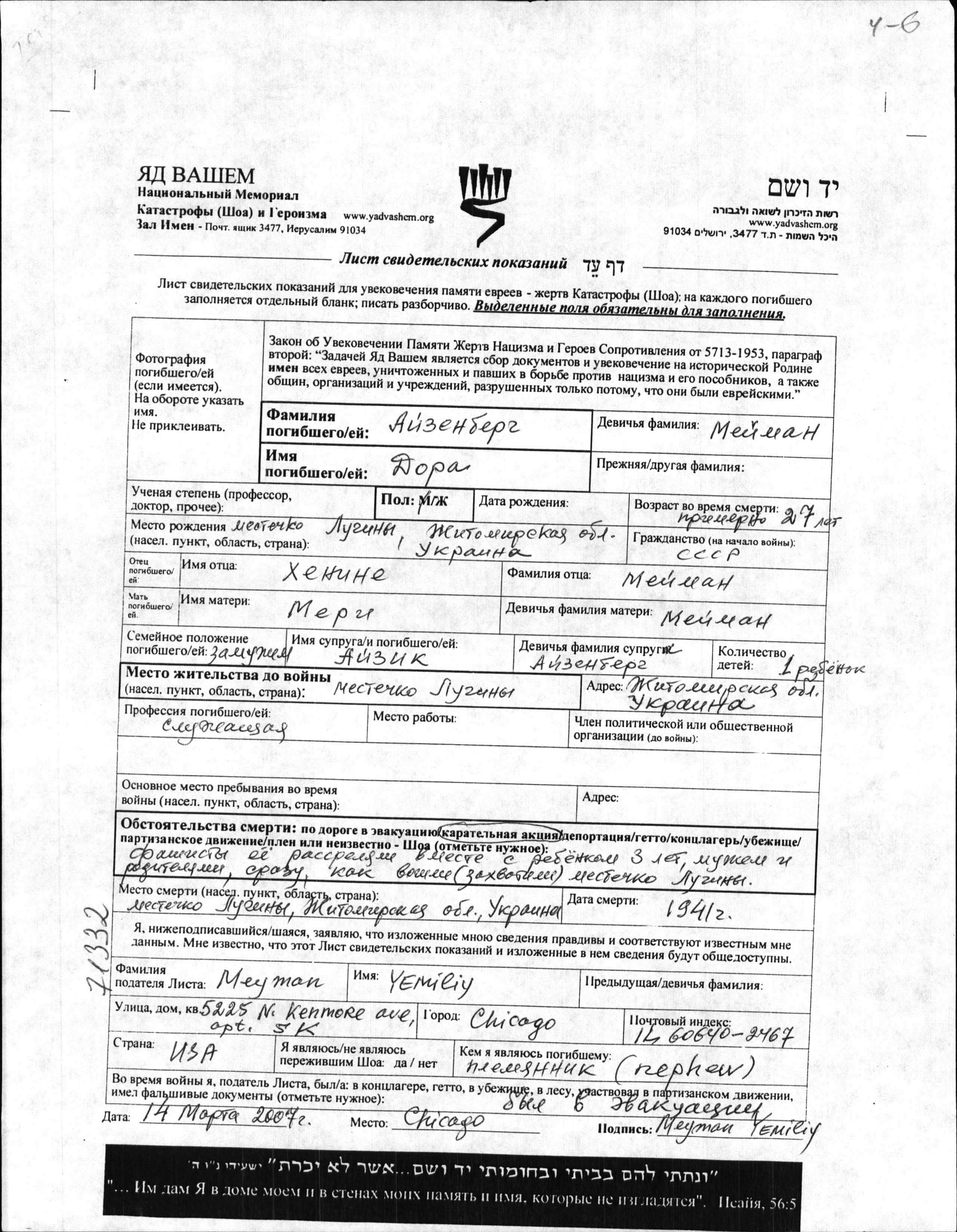 Dora Aizenberg nee Meiman was born in Luginy, Ukraine (USSR) to Khenine and Meri nee Meiman. She was an employee and married to Aizik. Prior to WWII she lived in Luginy, Ukraine (USSR). During the war she was in Luginy, Ukraine (USSR). Dora was murdered in the Shoah. Place of death: Luginy, Ukraine (USSR), 1941.