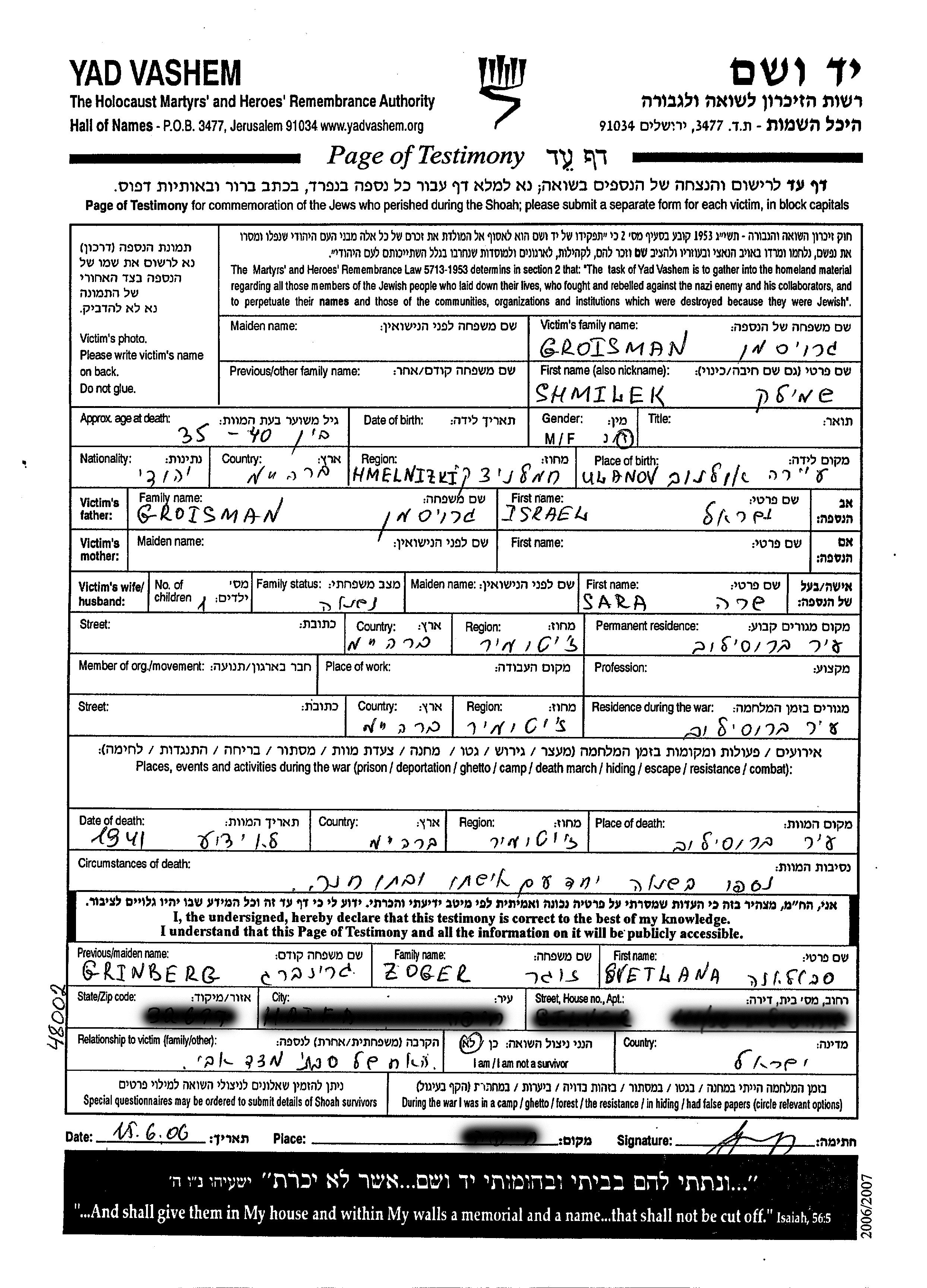 Khana Groisman was born to Shmilek and Sara. She was child. Prior to WWII she lived in Brusilov, Ukraine (USSR). During the war she was in Brusilov, Ukraine (USSR). Khana was murdered in the Shoah.