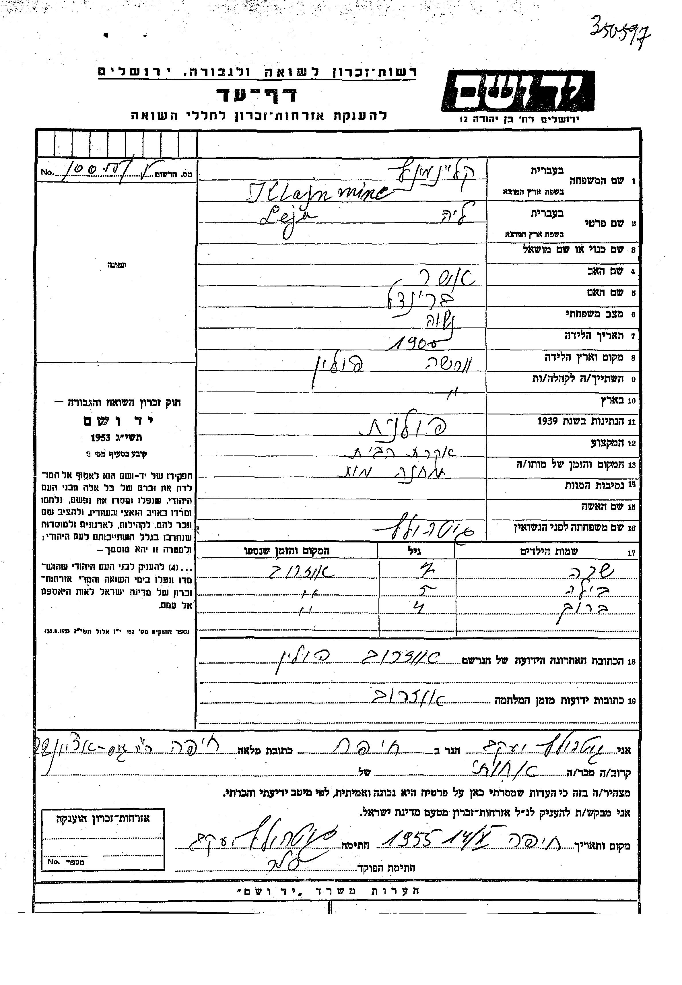 Klajnminc Barukh Warszawa, Poland Page of Testimony