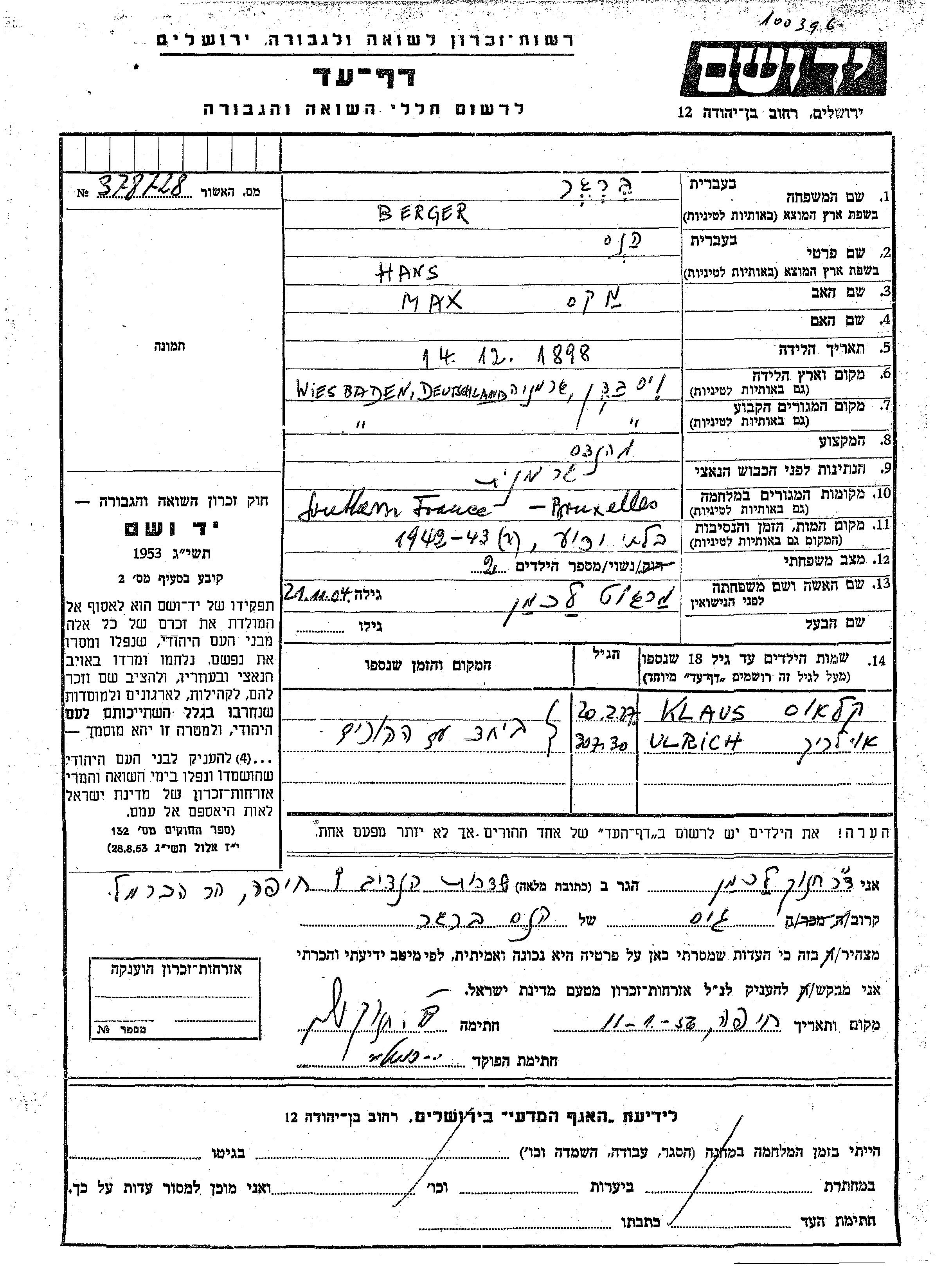 Berger Klaus 1937 Wiesbaden, Germany Page of Testimony