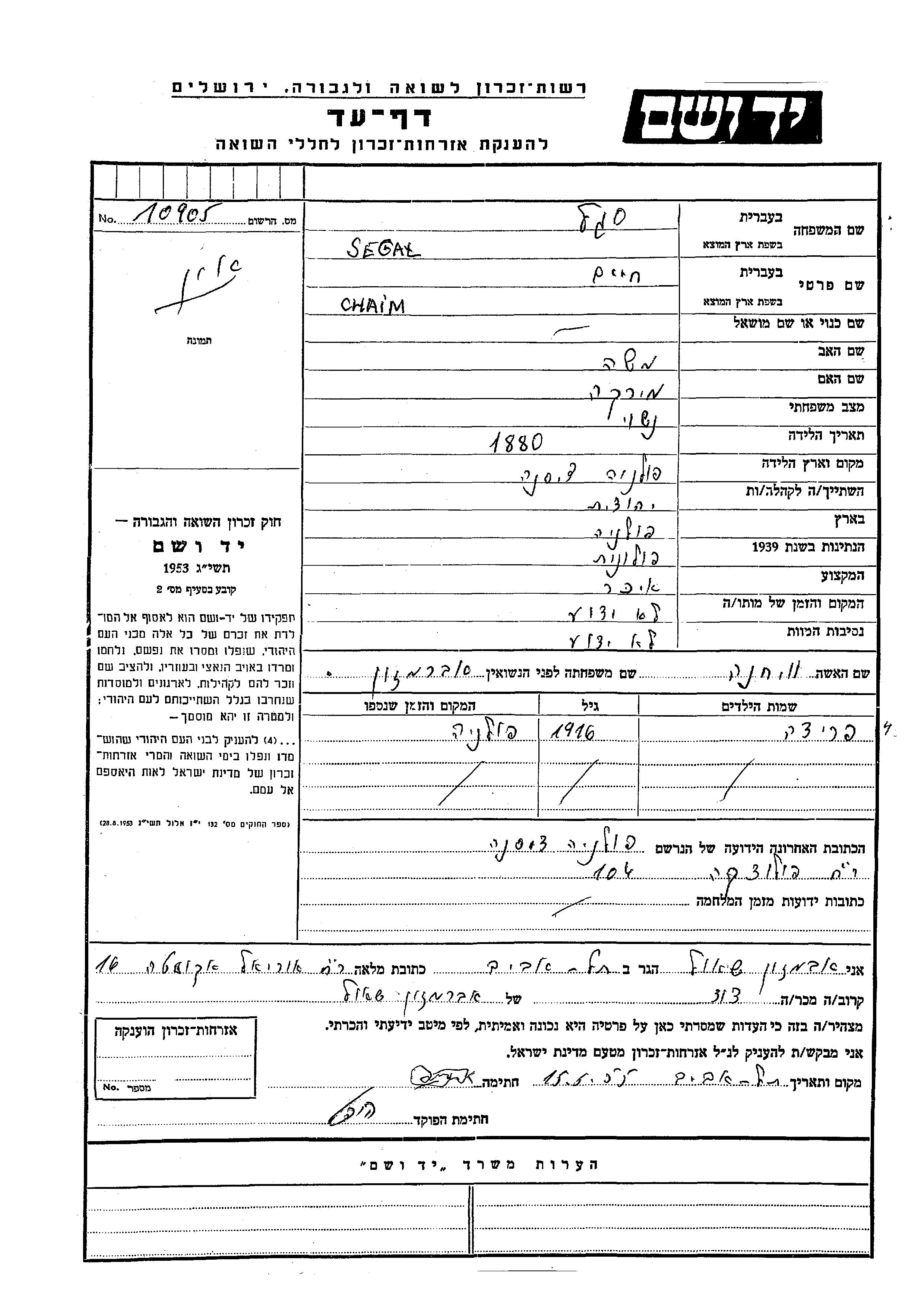 Yad Vashem - Pages of Testimony Names Memorial Collection