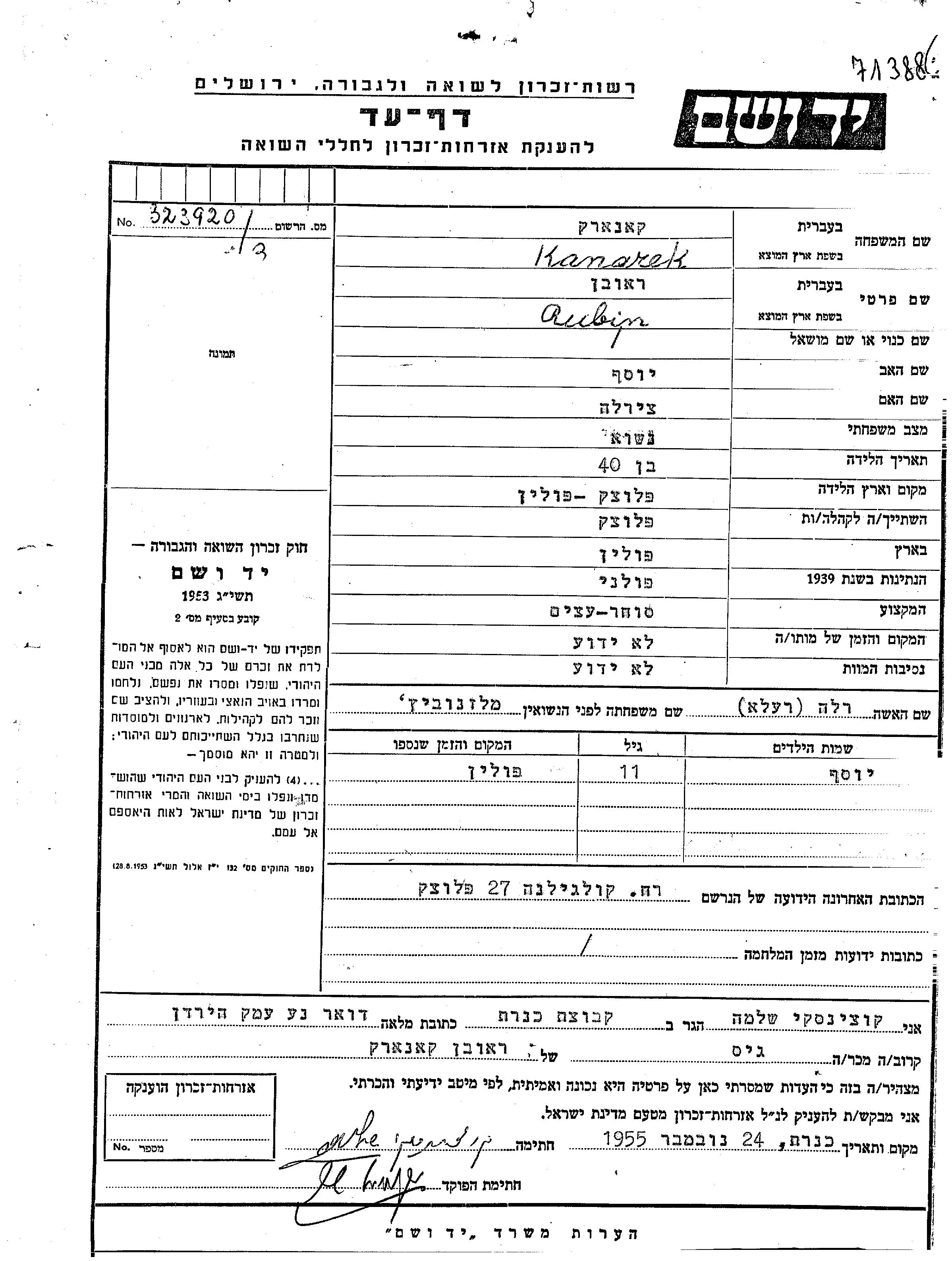 Yosef Kanarek was born to Rubin and Rela nee Melzenovitz. He was child. Prior to WWII he lived in Plock, Poland.