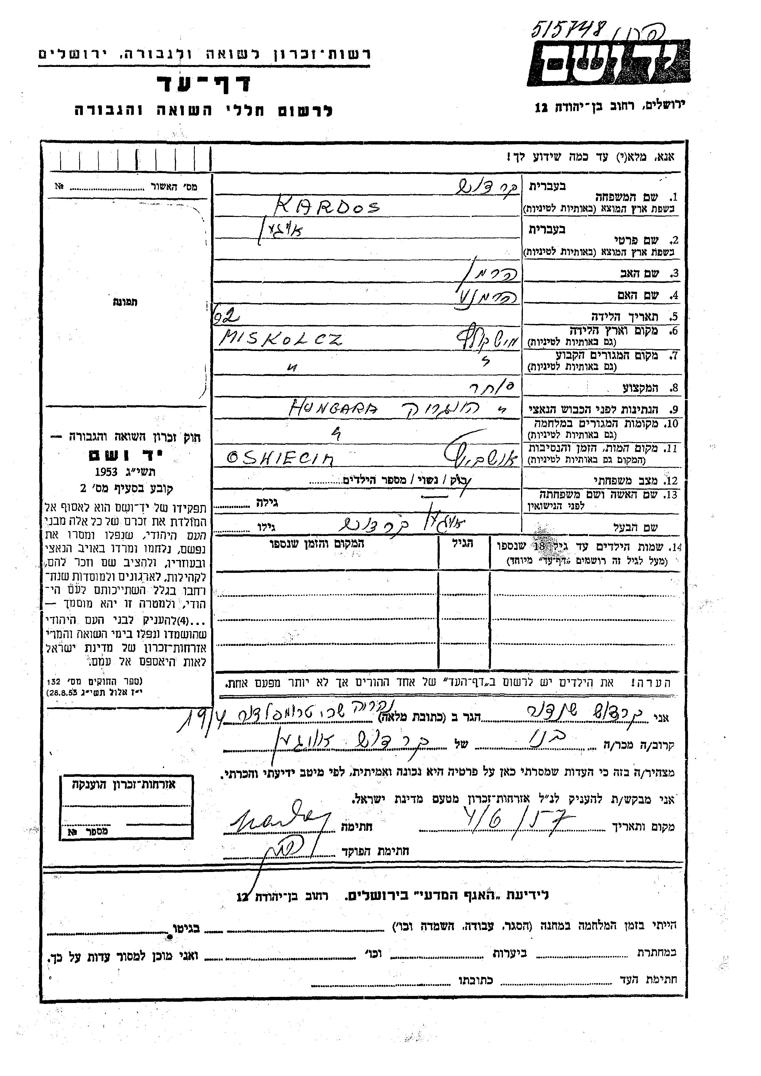 Kardos Oigen Miskolcz, Hungary Page of Testimony