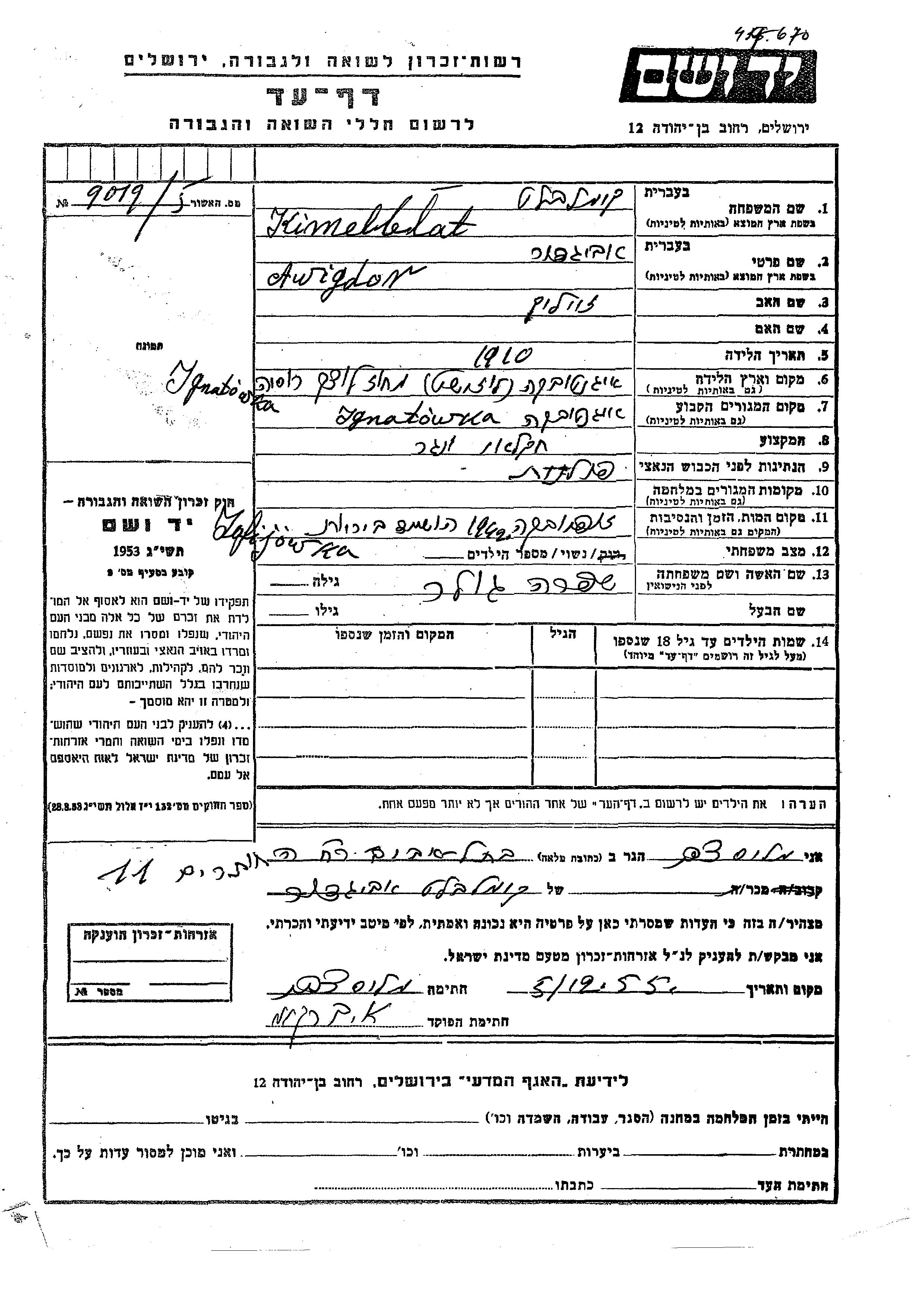 Awigdor Kimelblat was born in Ignatowka, Poland, 1910 to Zeilik. He was an agriculturist and married to Shifra nee Goler. Prior to WWII he lived in Ignatowka, Poland. Awigdor was murdered in the Shoah. Place of death: Zofjówka, Poland, 1942.