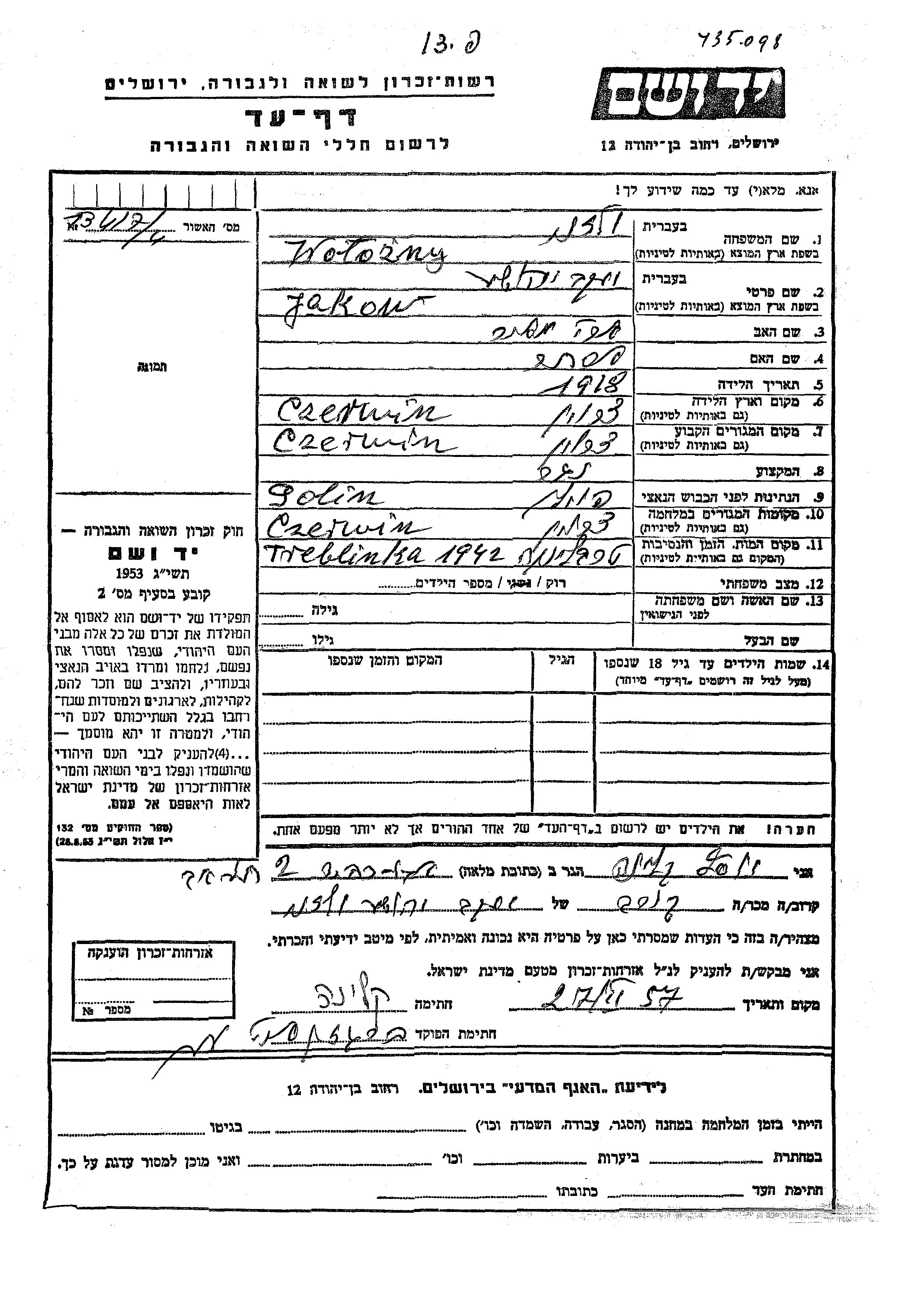 Yakow Yehoshua Wolozny was born in Czerwin, Poland, 1918 to Ari Meir and Ester. He was a carpenter and single. Prior to WWII he lived in Czerwin, Poland. During the war he was in Czerwin, Poland. Yakow Yehoshua was murdered in the Shoah. Place of death: Treblinka, Poland, 1942.