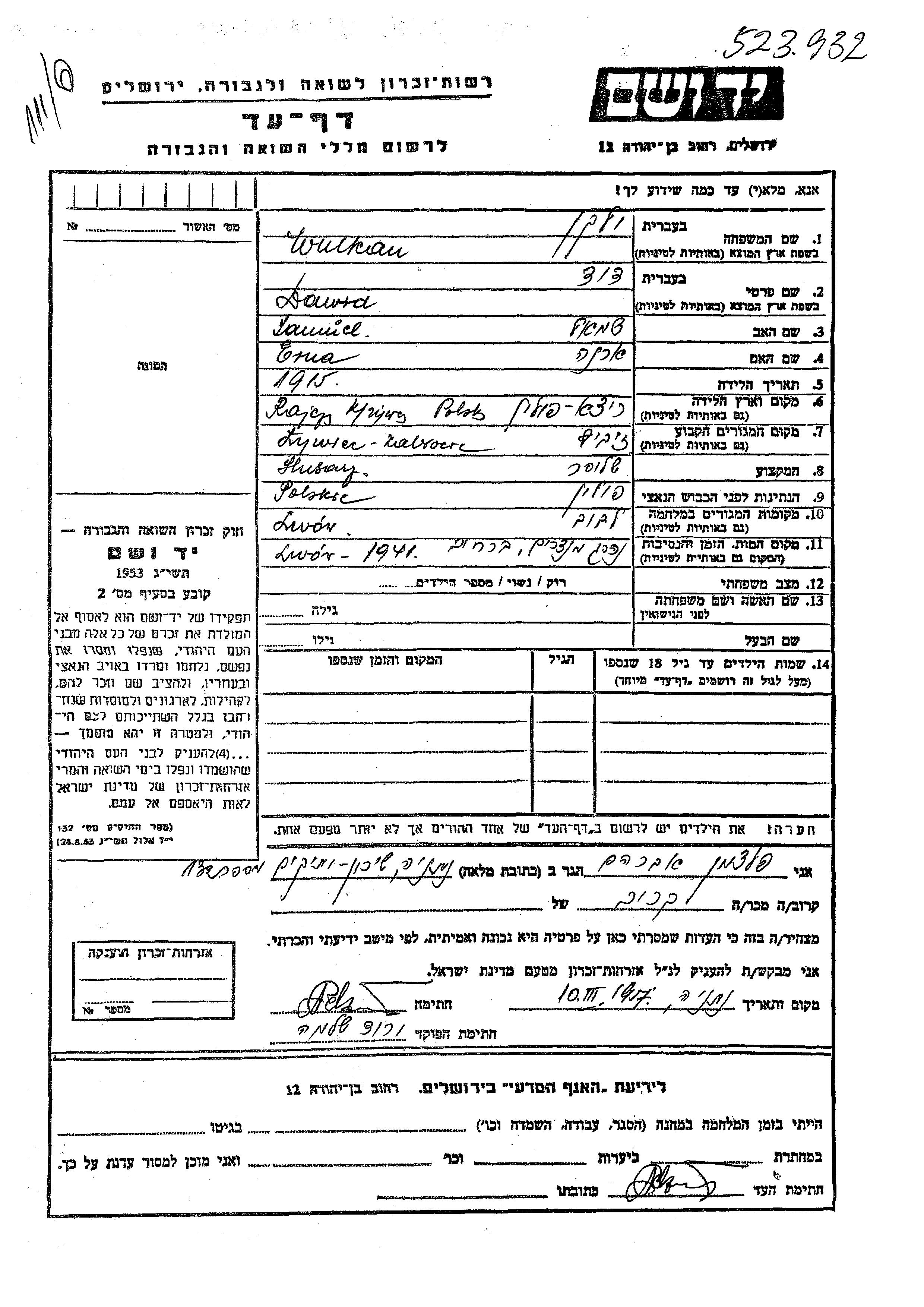Dawid Wulkan Volken was born in Rajcza, Poland, 1915 to Samuiel and Erna. He was a metalworker. Prior to WWII he lived in Zywiec, Poland. During the war he was in Lwow, Poland. Dawid was murdered in the Shoah. Place of death: Lwow, Poland, 1941.