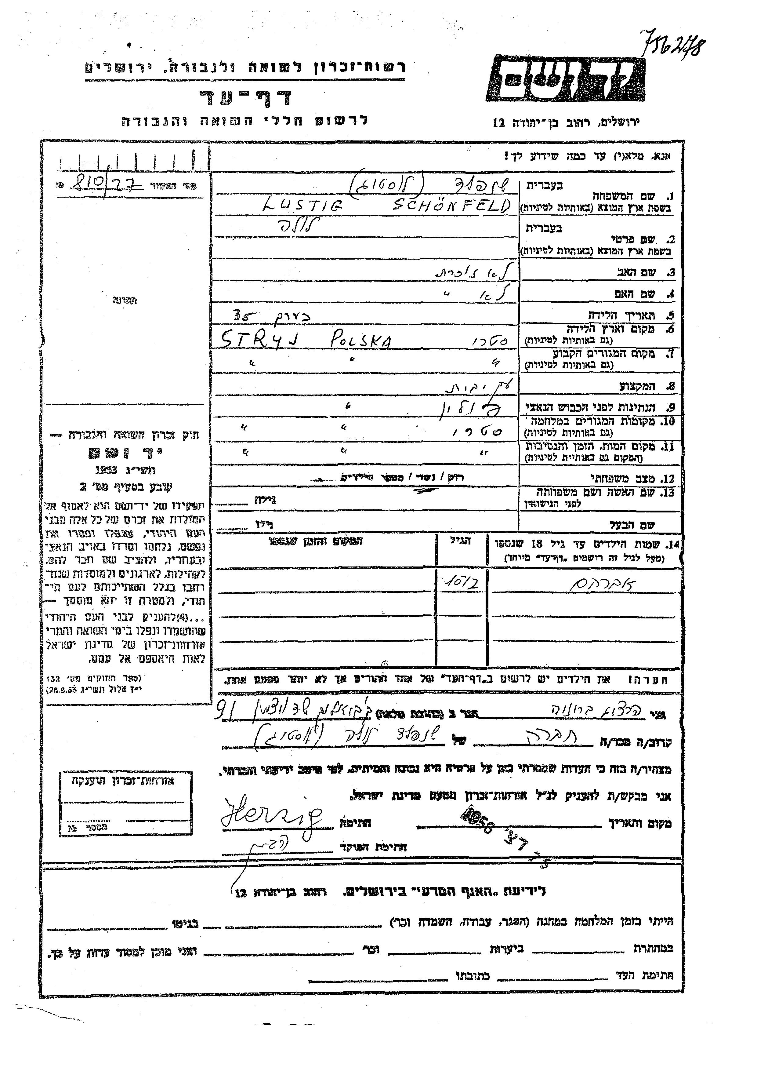 Avraham Schonfeld was born to Lola nee Lustig. He was child. Prior to WWII he lived in Stryj, Poland. During the war he was in Stryj, Poland.