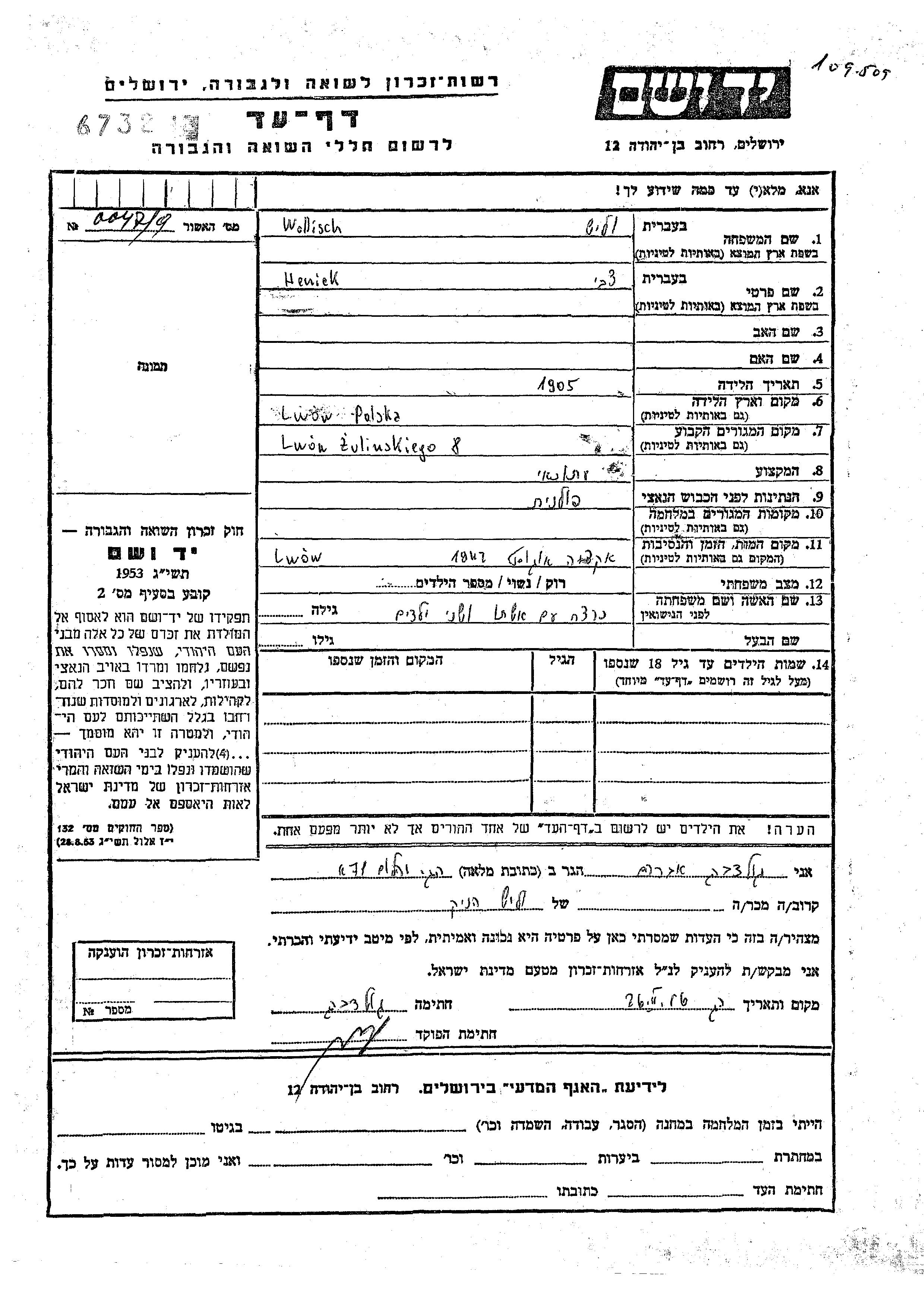 Tzvi Heniek Wollisch was born in Lwow, Poland, 1905. He was a journalist and married. Prior to WWII he lived in Lwow, Poland. Tzvi Heniek was murdered in the Shoah. Place of death: Lwow, Poland, 1942.