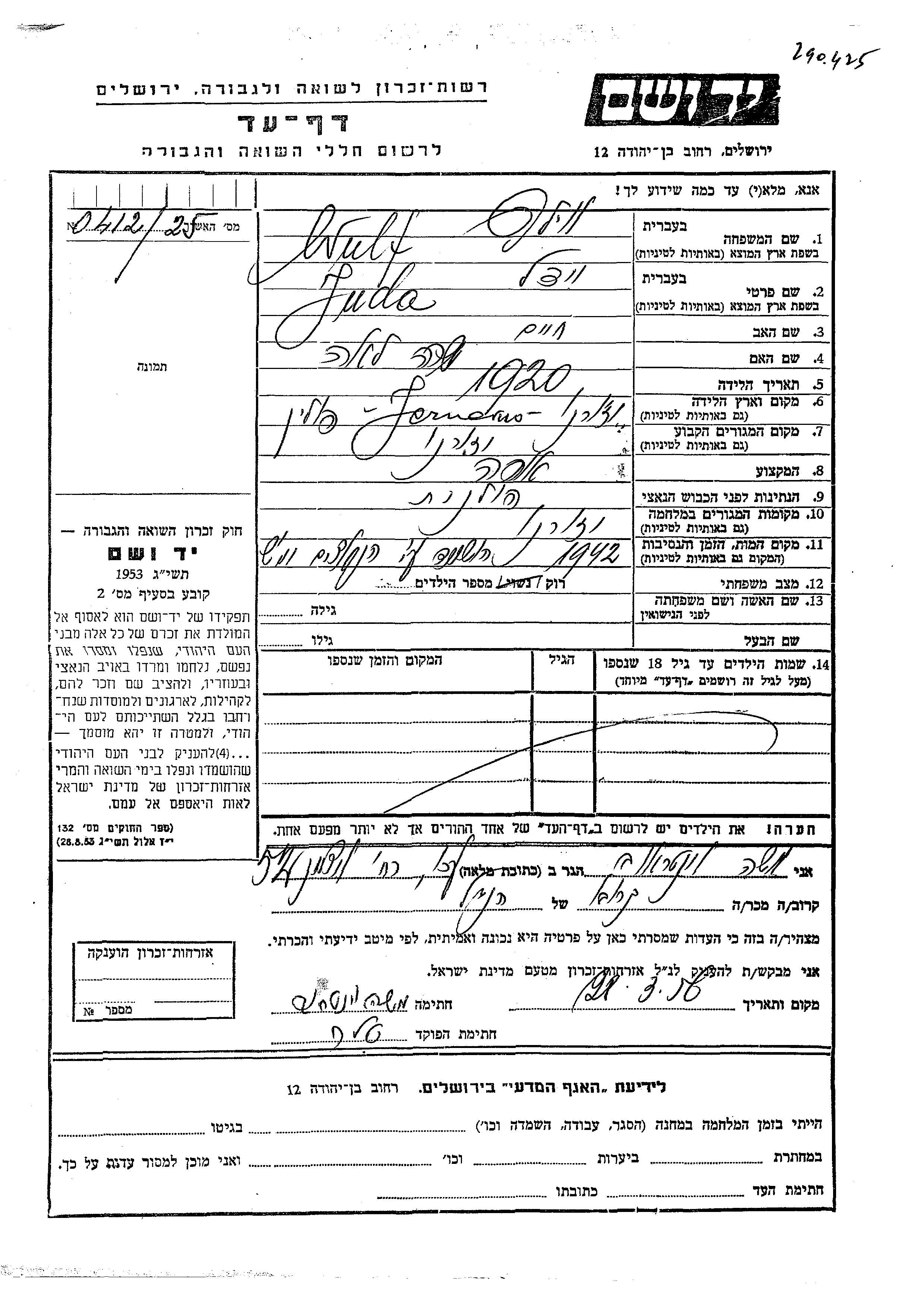 Juda Wulf was born in Jeziorna, Poland, 1920 to Khaim and Sara Lea. He was a baker and single. Prior to WWII he lived in Jeziorna, Poland. During the war he was in Jeziorna, Poland. Juda was murdered in the Shoah. Place of death: unknown, 1942.