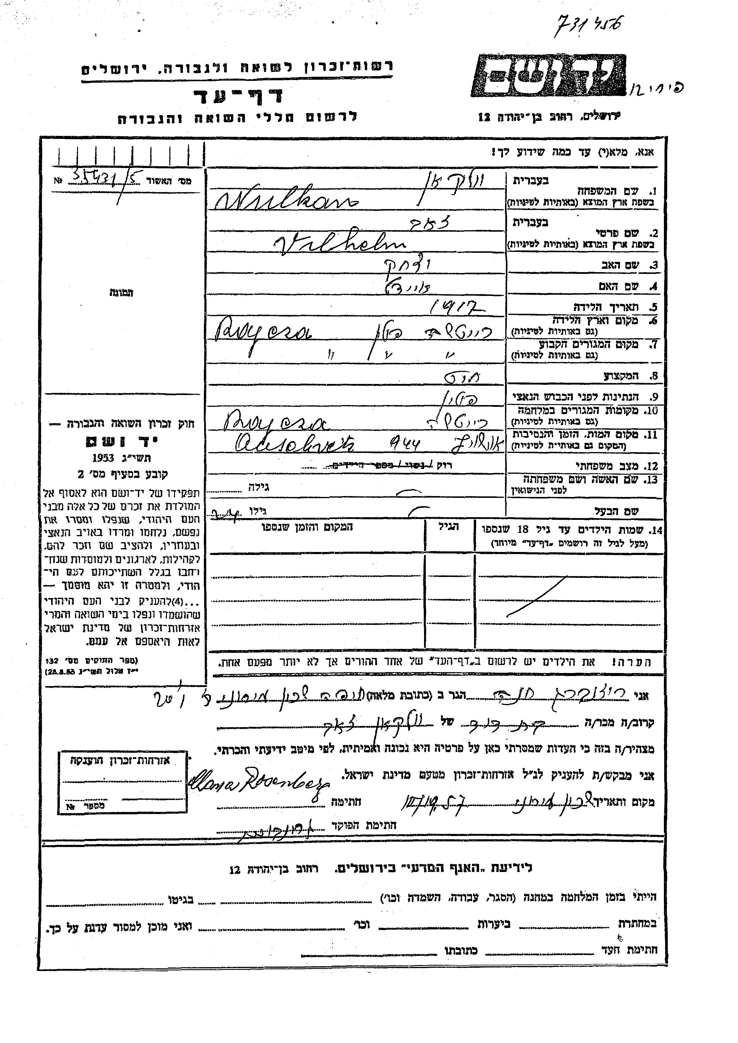 Vilhelm Zeev Wulkan Volken was born in Rajcza, Poland, 1917 to Yitzkhak and Eidel. He was a tailor and single. Prior to WWII he lived in Rajcza, Poland. During the war he was in Rajcza, Poland. Vilhelm Zeev was murdered in the Shoah. Place of death: Auschwitz, Poland, 1944.