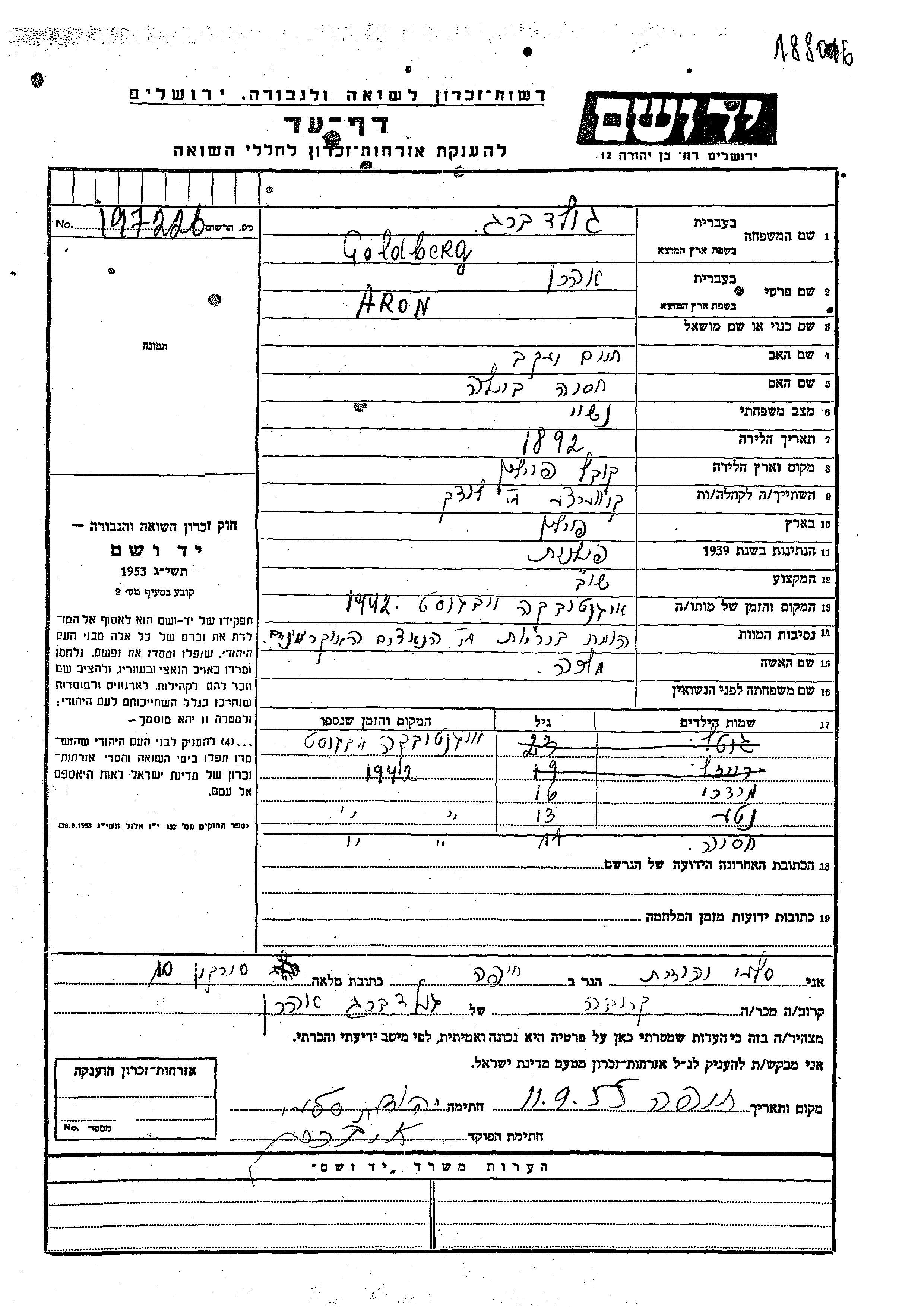 Yad Vashem - Pages of Testimony Names Memorial Collection