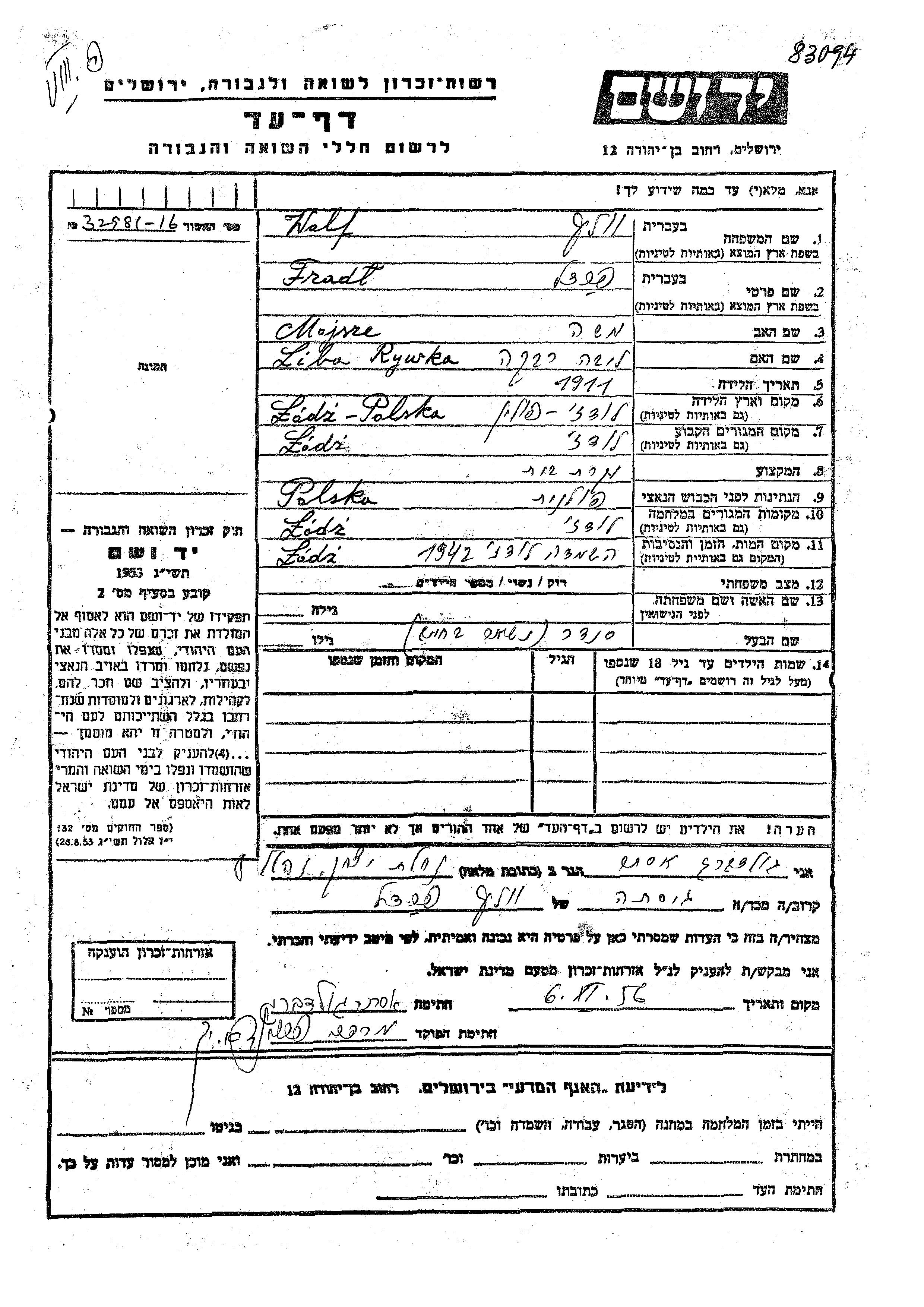 Fradl Wolf was born in Lodz, Poland, 1911 to Mojsze and Rywka Liba. She was a housewife and married to Sender. Prior to WWII she lived in Lodz, Poland. During the war she was in Lodz, Poland. Fradl was murdered in the Shoah. Place of death: Lodz, Poland, 1942.
