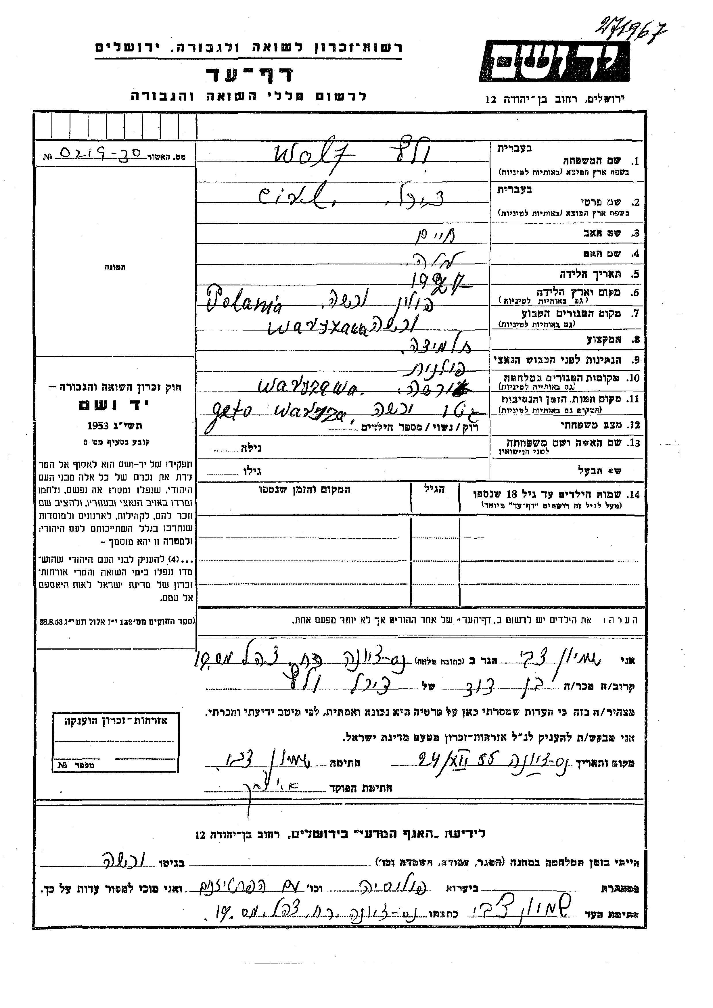 Wolf Cirl 1927 Warsaw, Poland Page of Testimony