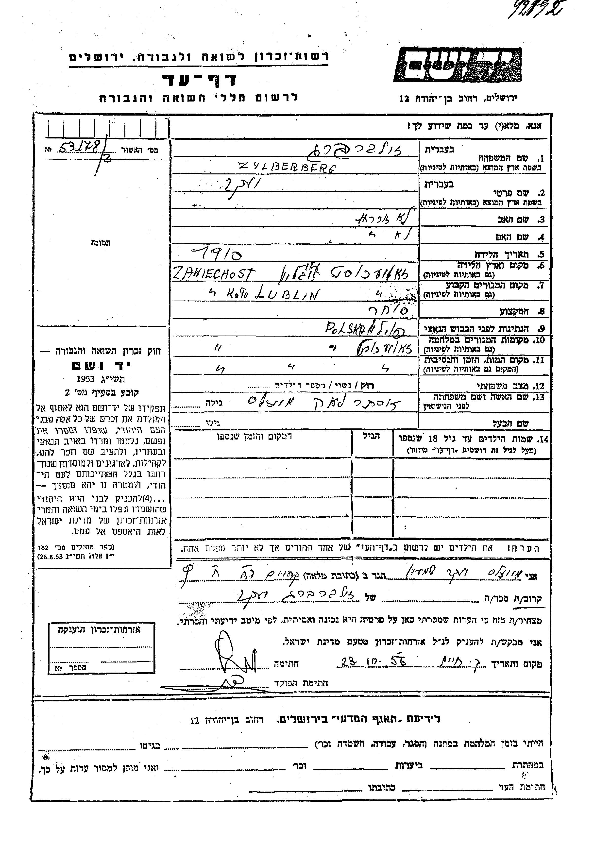 Yaakov Zylberberg was born in Zawichost, Poland, 1910. He was a merchant and married to Ester Lea nee Meizels. Prior to WWII he lived in Zawichost, Poland. During the war he was in Zawichost, Poland. Yaakov was murdered in the Shoah. Place of death: Zawichost, Poland.
