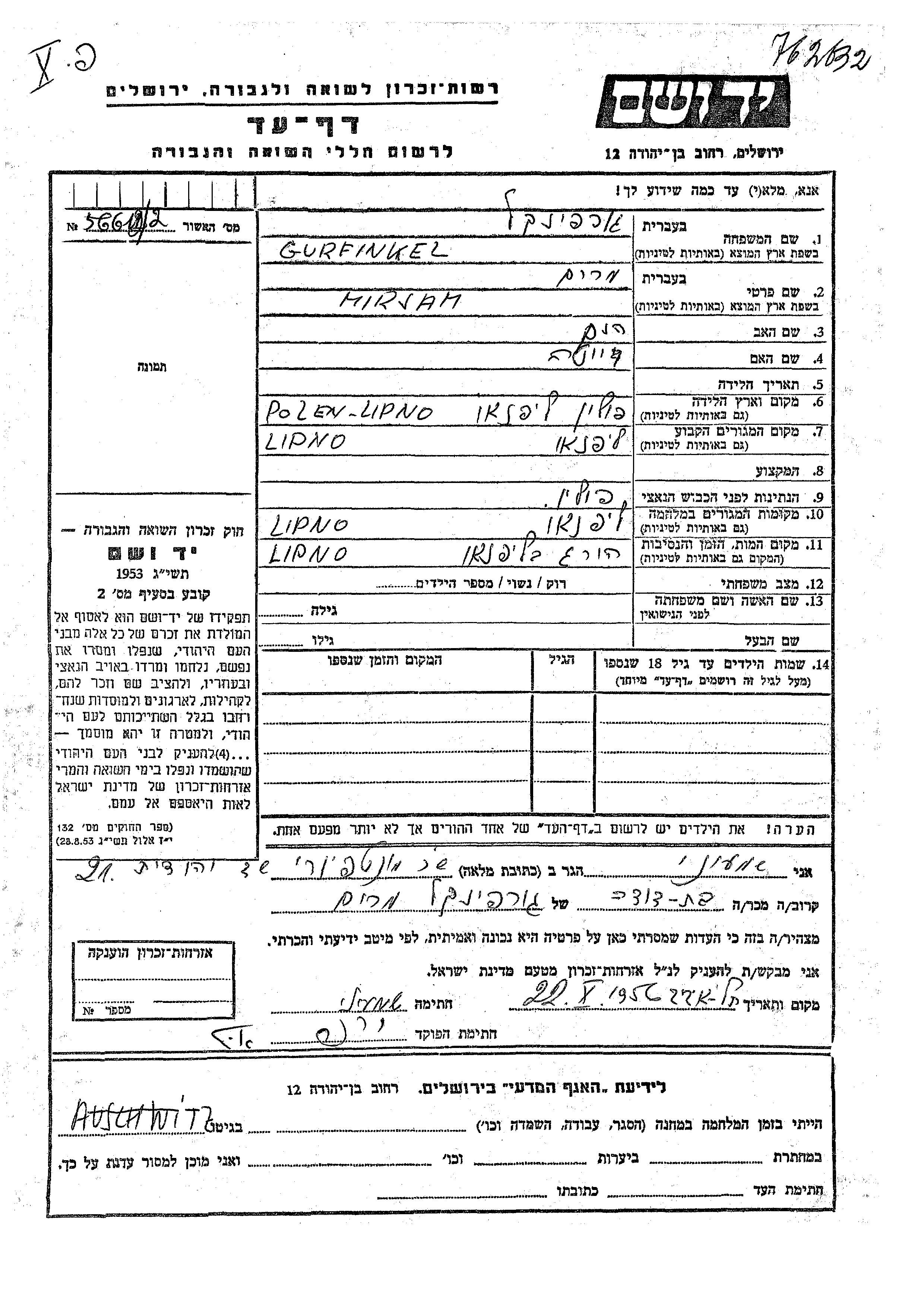 Mirjam Gurfinkel was born in Lipno, Poland to Henek and Reita. Prior to WWII she lived in Lipno, Poland. During the war she was in Lipno, Poland. Mirjam was murdered in the Shoah. Place of death: Lipno, Poland.