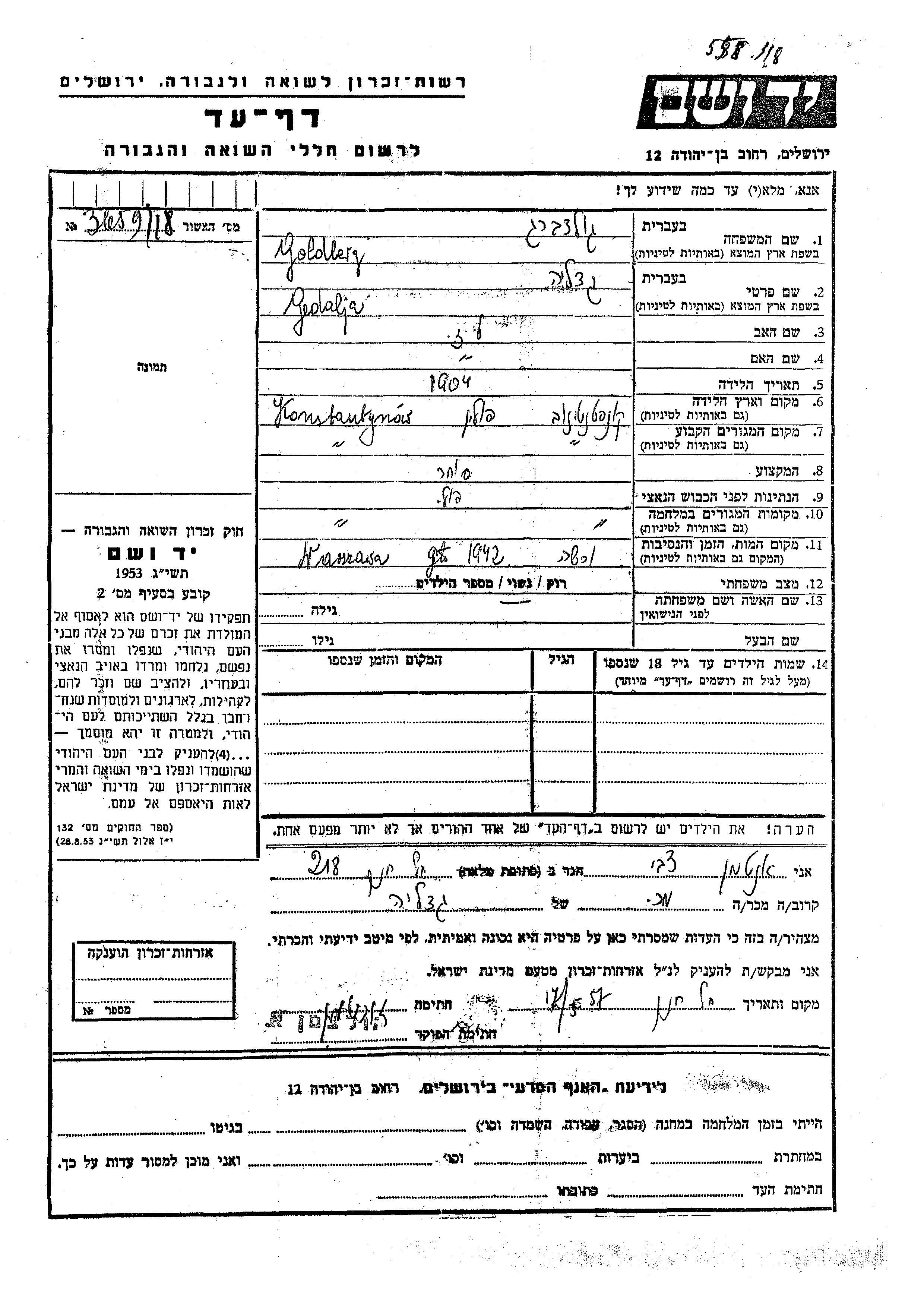 Gedalja Goldberg was born in Konstantynów, Poland, 1904. He was a merchant and married. Prior to WWII he lived in Konstantynów, Poland. During the war he was in Konstantynów, Poland. Gedalja was murdered in the Shoah. Place of death: Warszawa, Poland, 1942.
