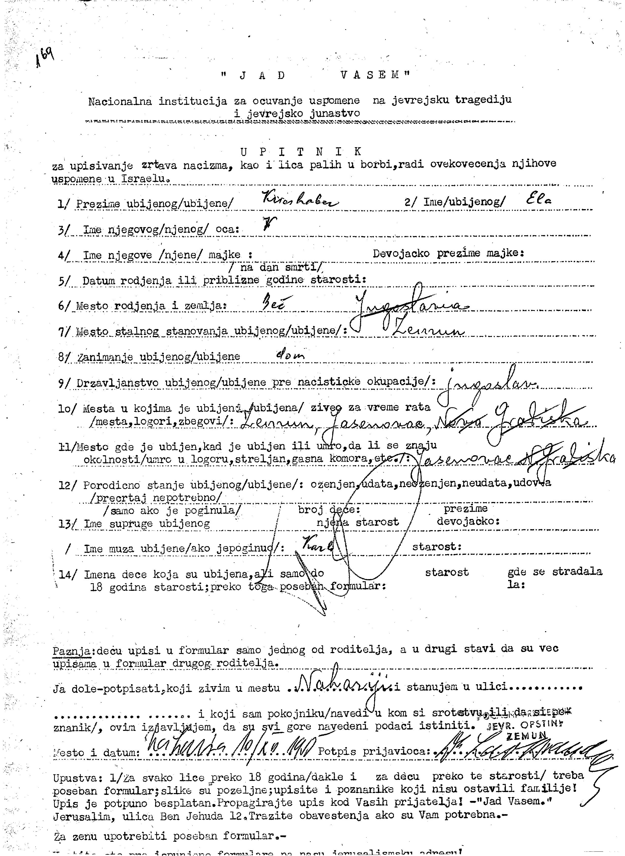 Kroshaber Ela Zemun, Yugoslavia Page of Testimony