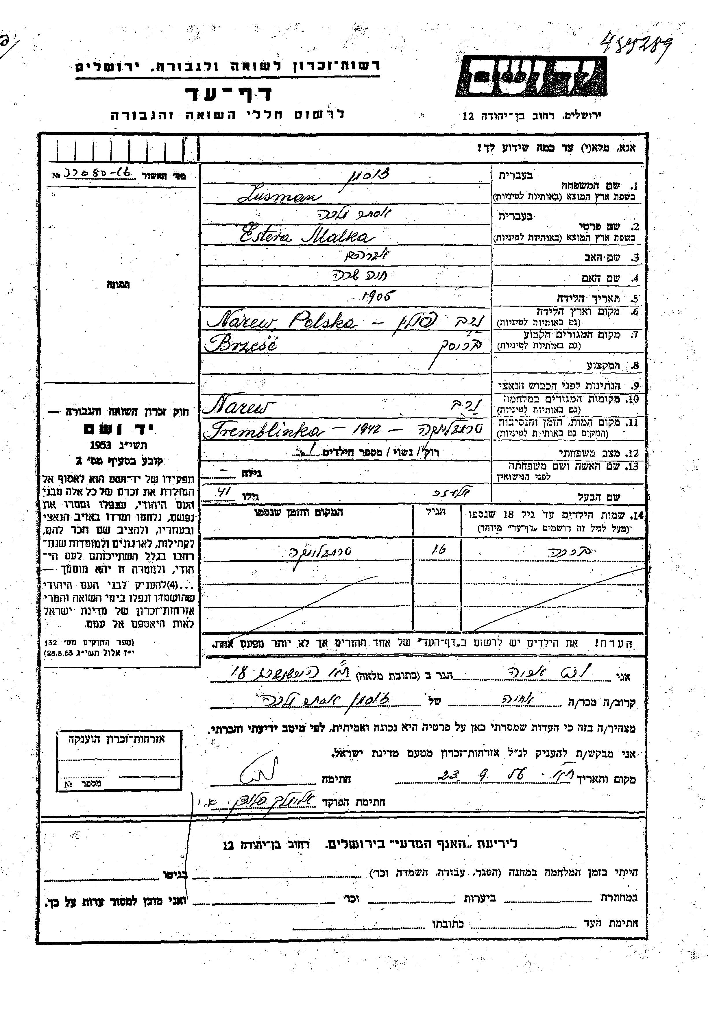Estera Malka Zusman was born in Narew, Poland, 1905 to Avraham and Khaia Sara. She was married to Elazar. Prior to WWII she lived in Brzesc, Poland. During the war she was in Narew, Poland. Estera Malka was murdered in the Shoah. Place of death: Treblinka, Poland, 1942.