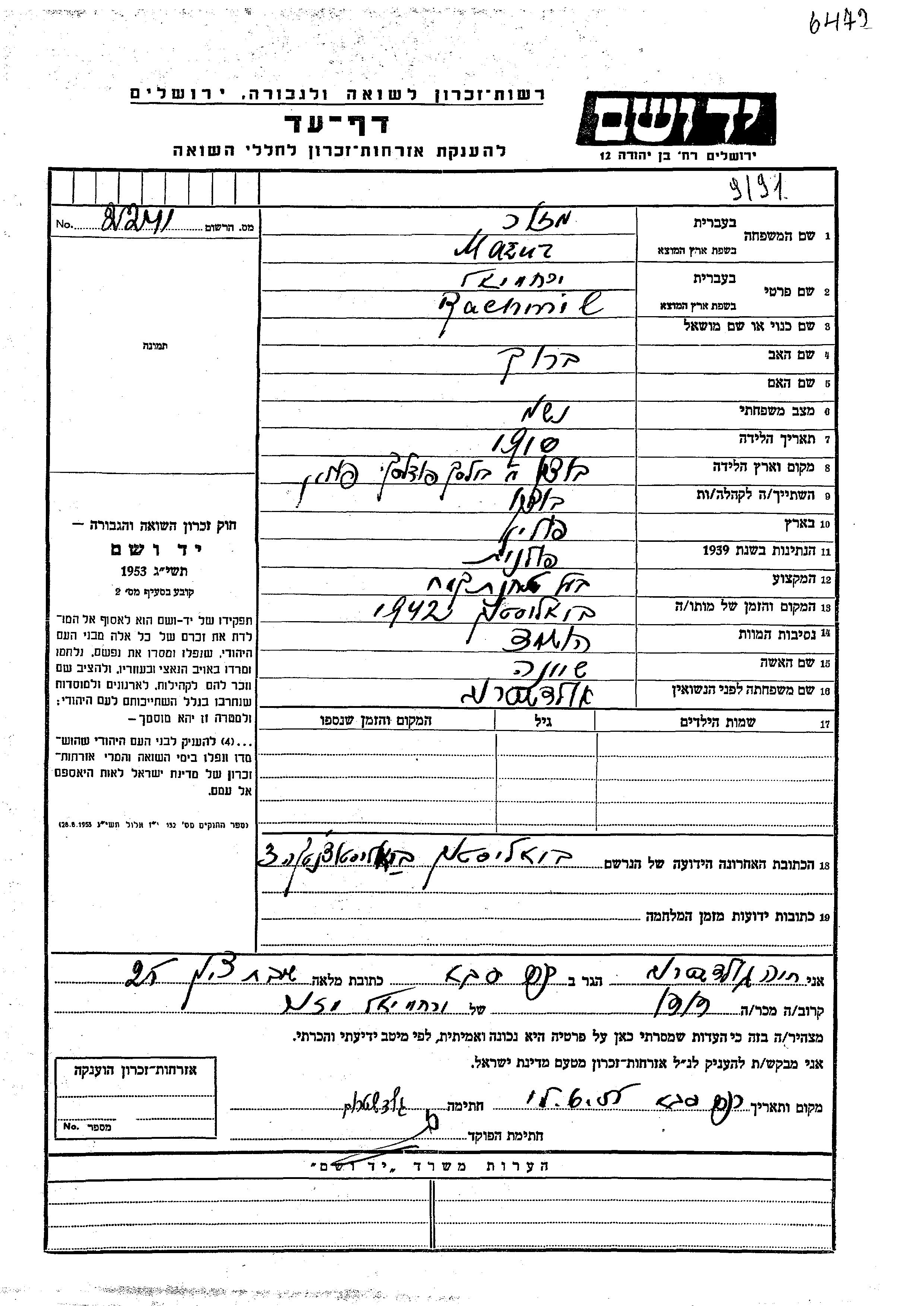 Rachmil Meizler Mazur was born in Bocki, Poland, 1910 to Barukh. He was a flourmill owner. Prior to WWII he lived in Bocki, Poland. During the war he was in Bialystok, Poland. Rachmil was murdered in the Shoah. Place of death: Bialystok, Poland, 1942.